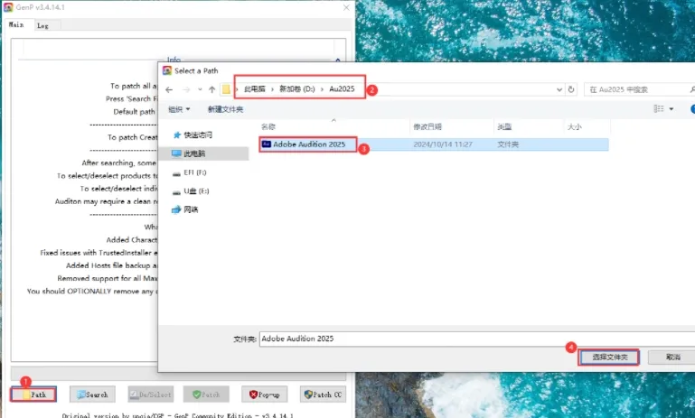 13. 开始激活:点击“Path”,在弹出的对话框中找到软件安装目录(步骤四和步骤六中所更改的位置)下的“Adobe Audition 2025”文件夹并打开。