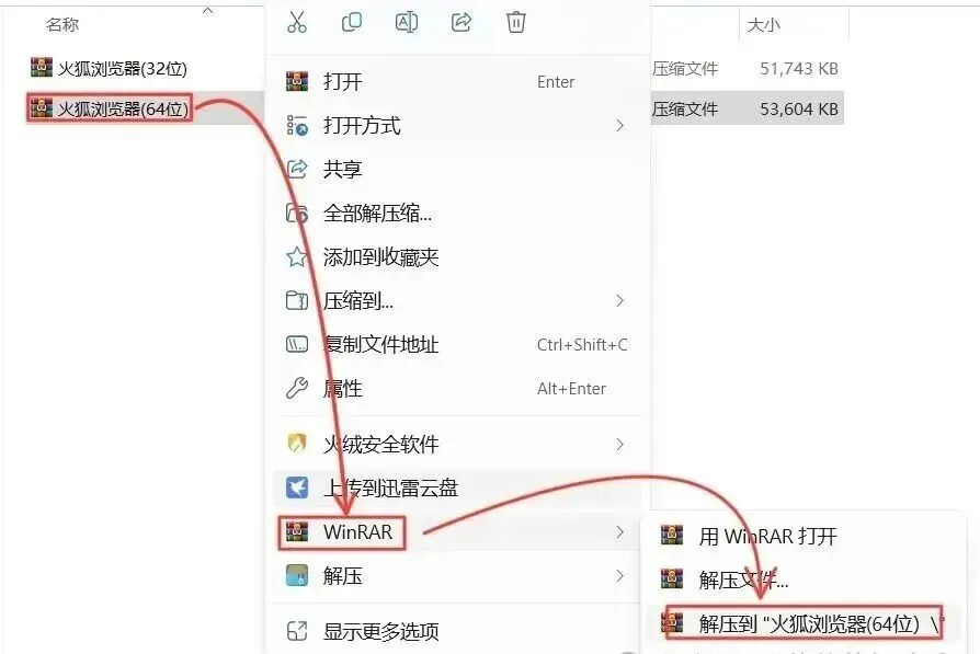 1.打开下载的浏览器安装包,鼠标右击压缩包【解压到火狐浏览器】。