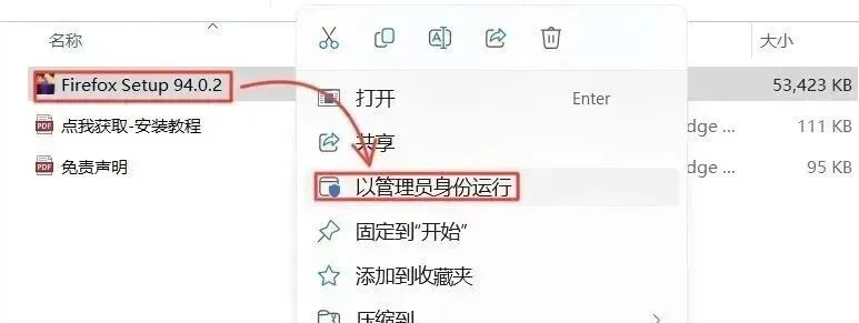 3.打开解压后的文件夹,鼠标右击【Firefox Setup 94.0.2.exe】,选择【以管理员身份运行】(这步很重要!不然可能安装失败)。