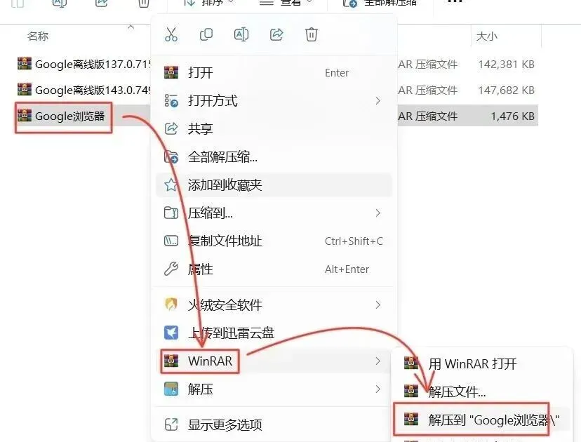 1.打开下载的浏览器安装包,鼠标右击压缩包【解压到Google浏览器】。