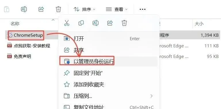 3.打开解压后的文件夹,鼠标右击【ChromeSetup.exe】,选择【以管理员身份运行】(这步很重要!不然可能安装失败)。