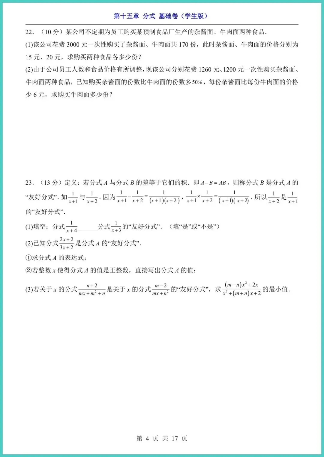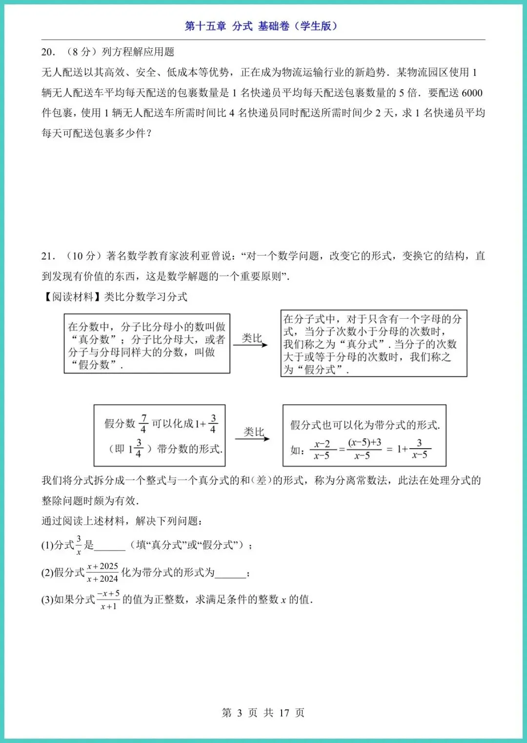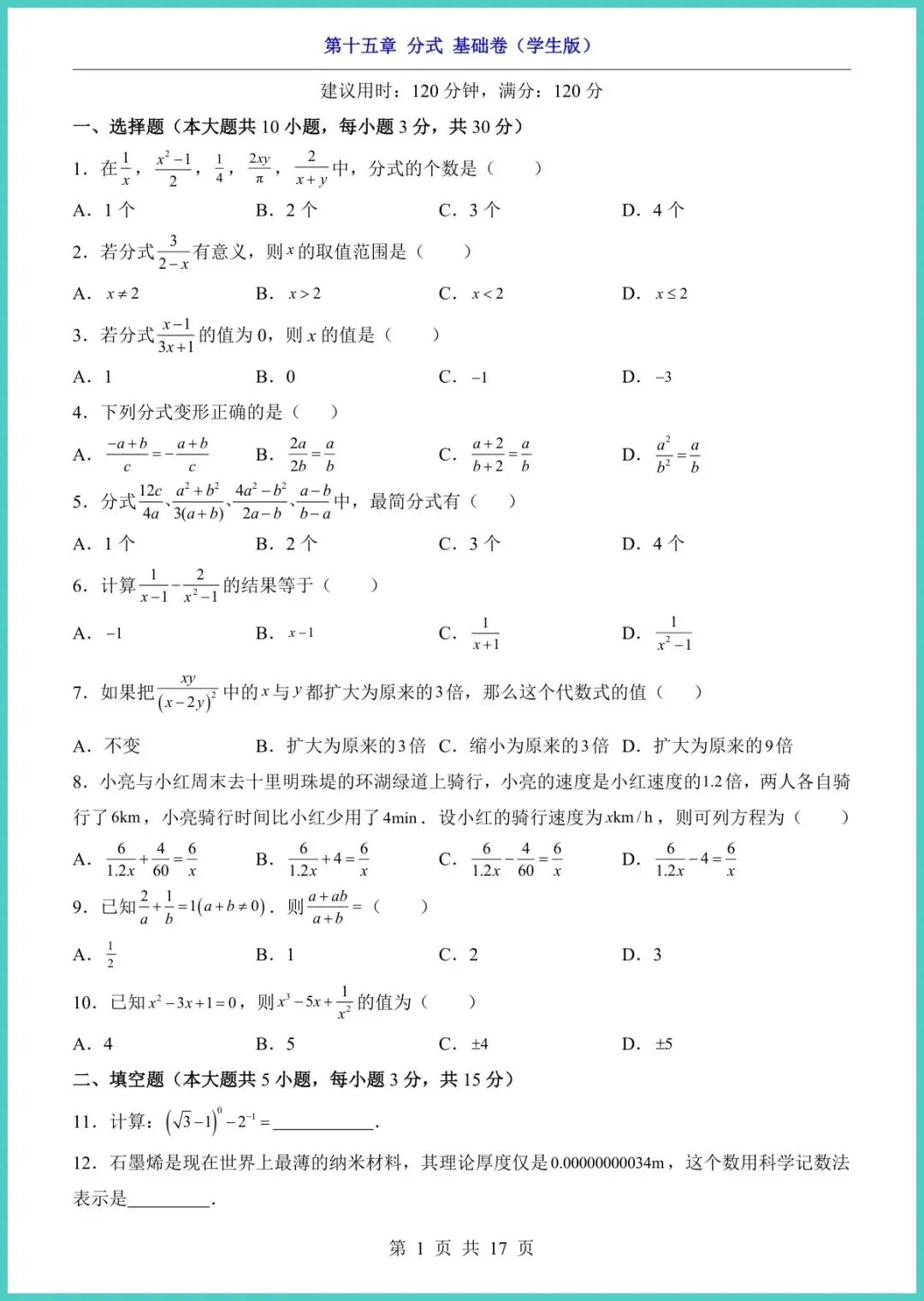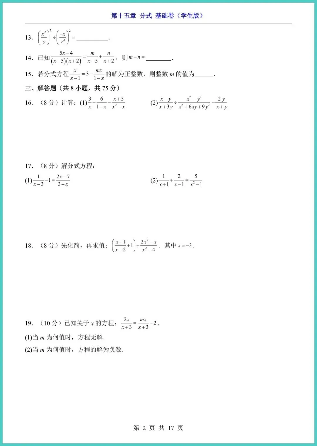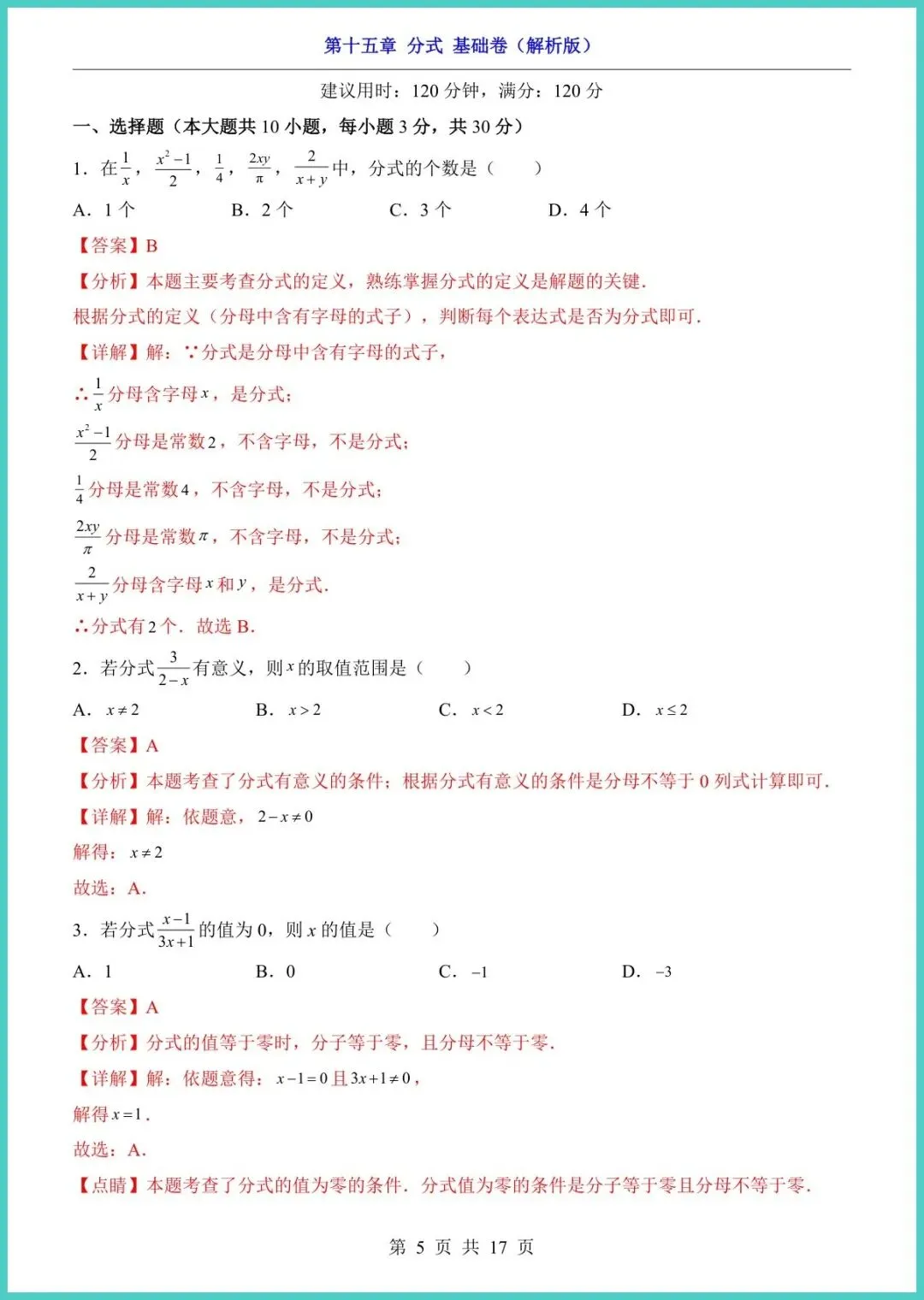 2025春华东师大版八年级下册数学第15章《分式》基础卷新鲜出炉!17页精华,紧扣教材,题型由浅入深,覆盖分式概念、运算、化简、求值、应用五大考点,配详细答案与易错提醒。每天10分钟,帮孩子把“一看就会、一算就错”的分式难题变成送分题,期中提分稳稳的!家有八年级娃的家长,马上打印,今晚就能练起来!