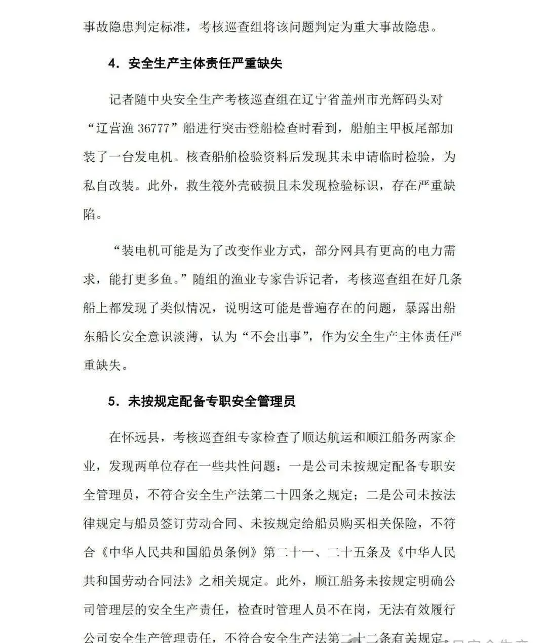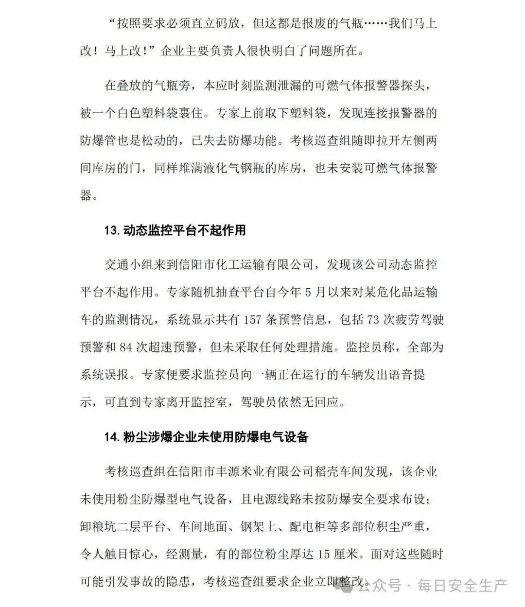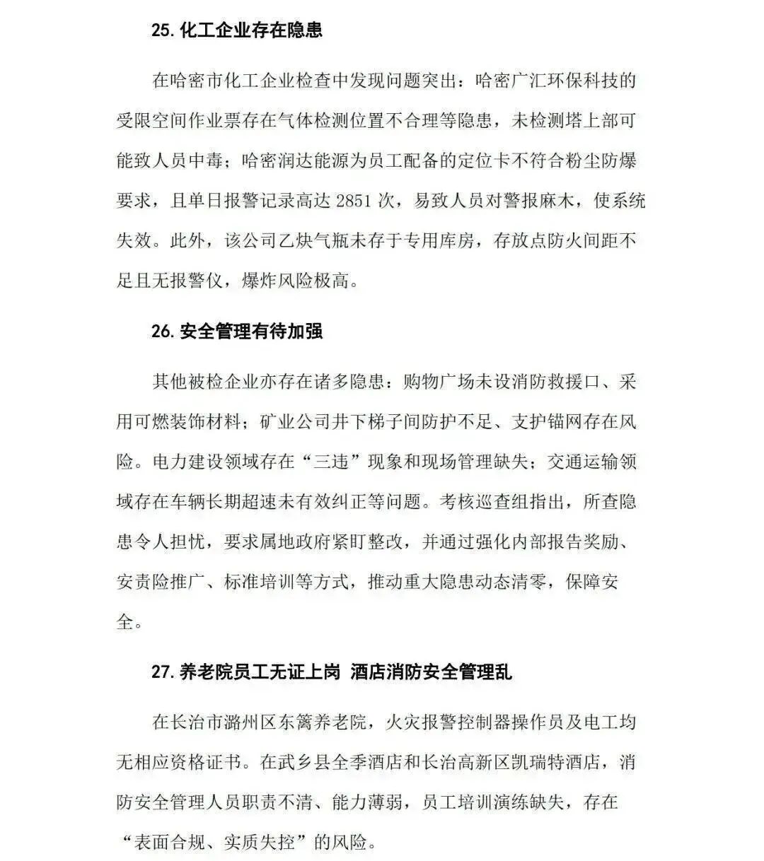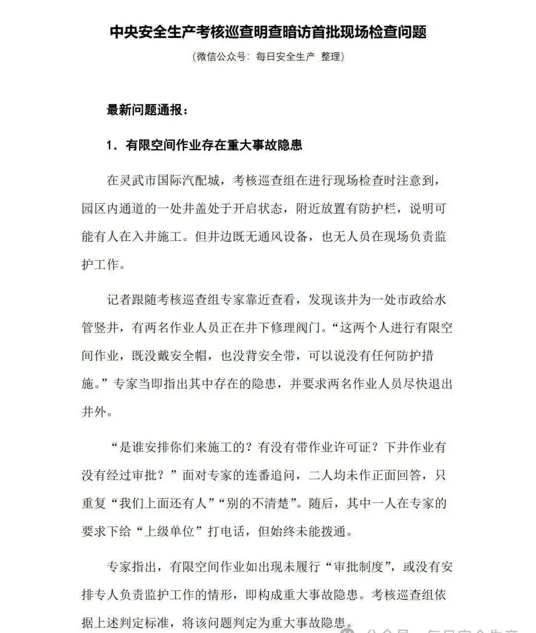 此次明查暗访将重点针对今年以来发生的典型事故和重大涉险事故暴露出的问题,聚焦安全生产责任落实情况、安全生产治本攻坚三年行动推进情况、安全生产重点任务和“一件事”全链条整治成效、重点行业领域重大安全风险隐患排查整治等,深入开展重大事故隐患排查整治和专家指导服务,通过发现问题倒查有关部门履职情况,督促推动各地区扎实开展树立和践行正确政绩观学习教育,统筹好发展和安全,切实提升风险隐患排查质效,及时消除安全隐患,坚决遏制事故多发势头,确保安全生产形势稳定。针对明查暗访发现的典型案例将依法查处、追责问责、公开曝光。