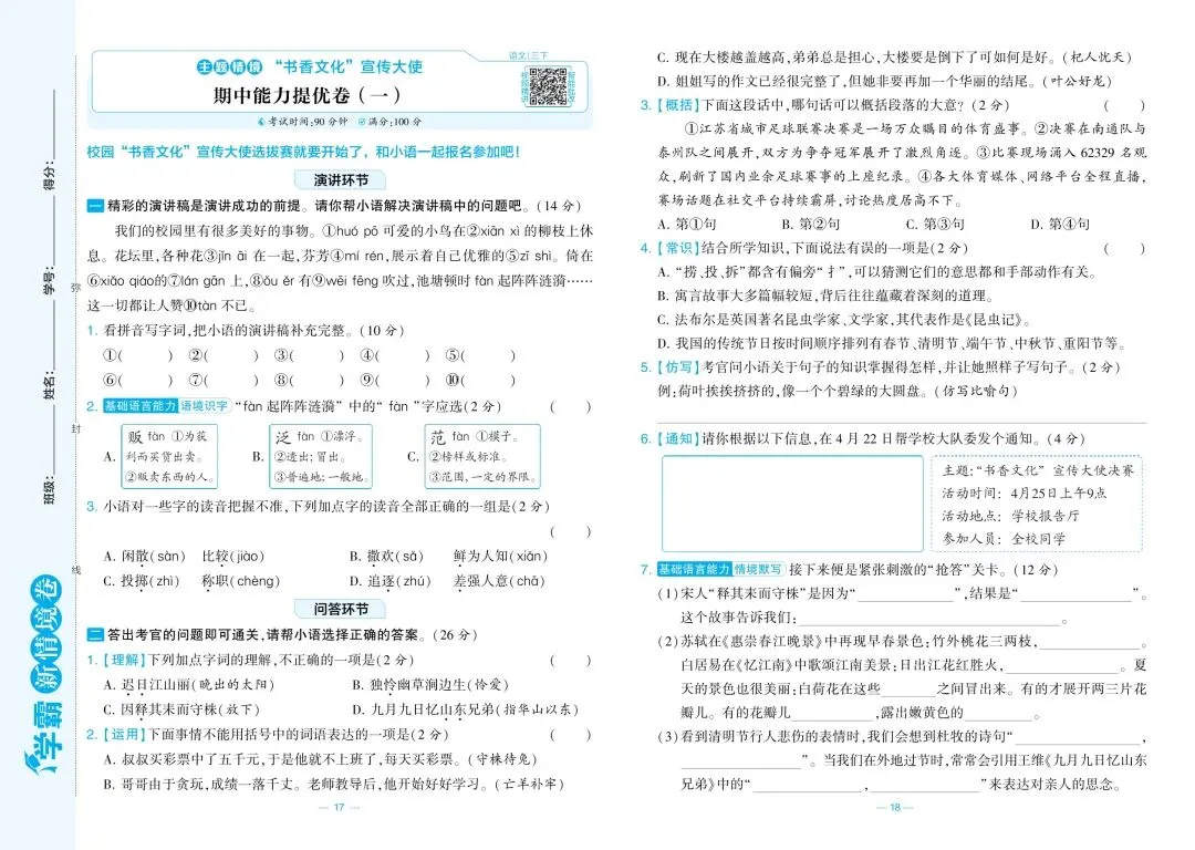 三年级别等考试才着急,现在就帮孩子做一次期中自测!