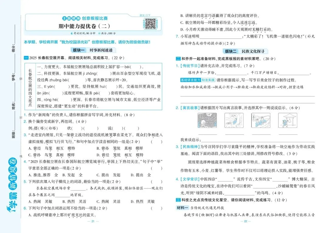 三年级语文期中模拟试卷