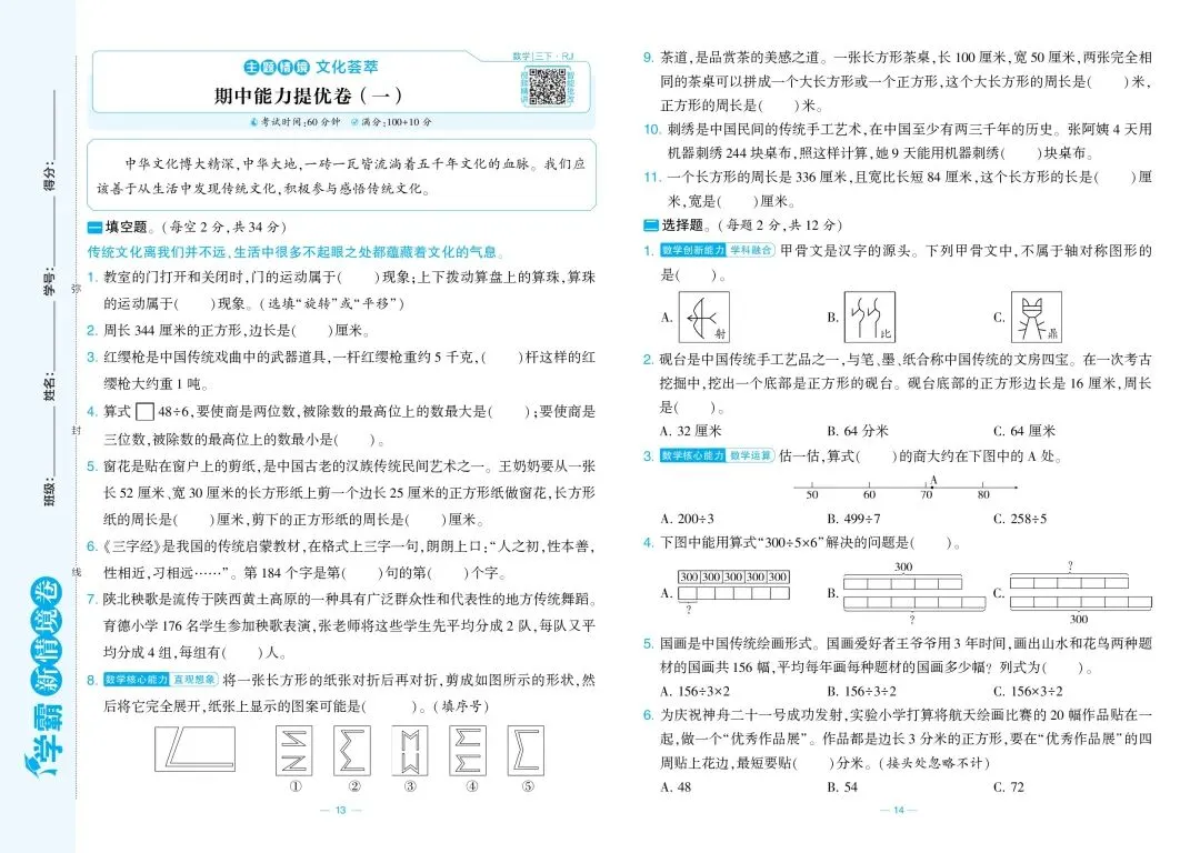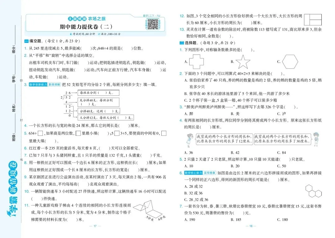 三年级数学期中模拟试卷