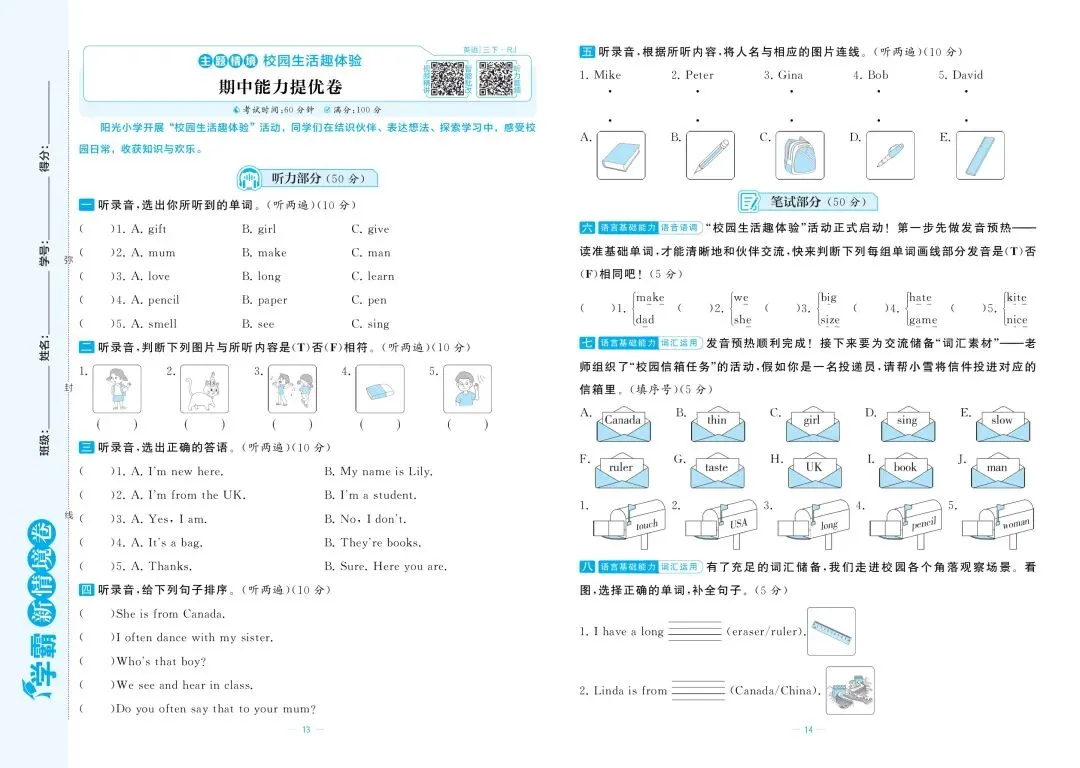 三年级英语期中模拟试卷