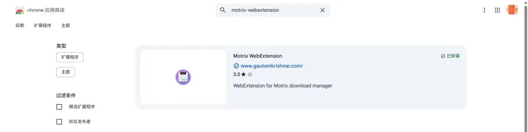 在 Chrome 商店地址:https://chromewebstore.google.com 中,搜索安装你需要的插件。这里以 motrix-webextension(Motrix 网页扩展) 为例。