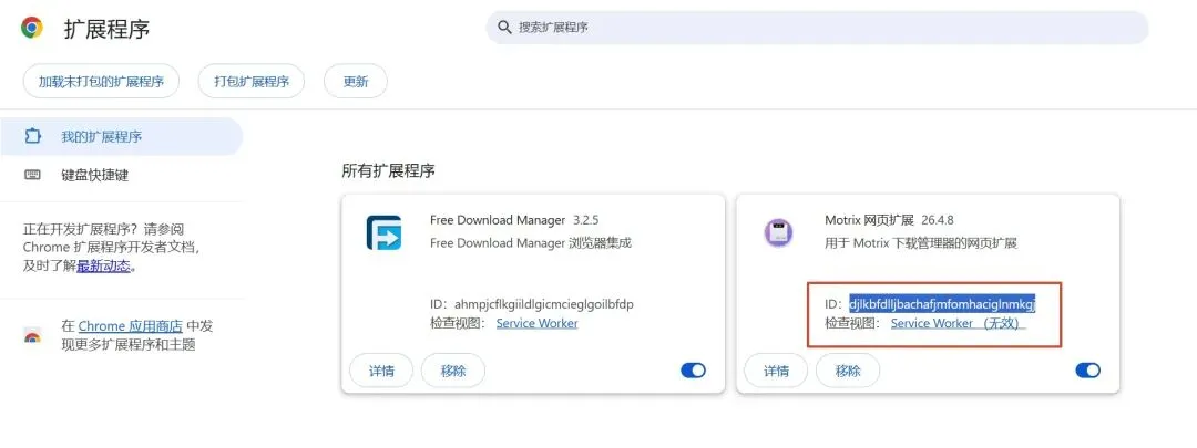 来到扩展程序的界面后,找到一个已安装待备份的插件,复制插件的ID
