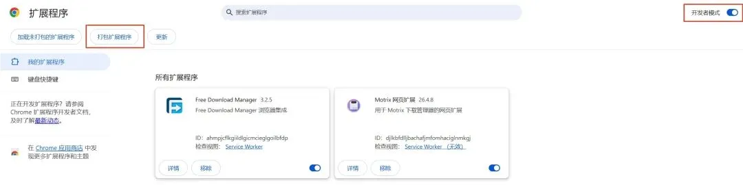 在 Google Chrome 扩展页面打开开发者模式,右侧就会出现打包扩展的按钮。