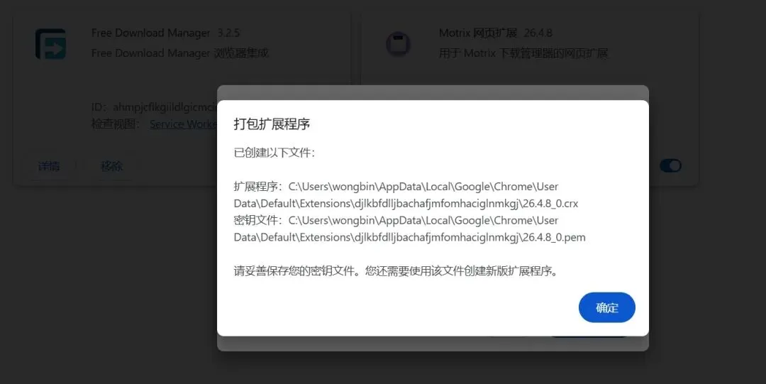 选择打包扩展程序,在下面粘贴完整的插件路径,选择打包扩展程序。