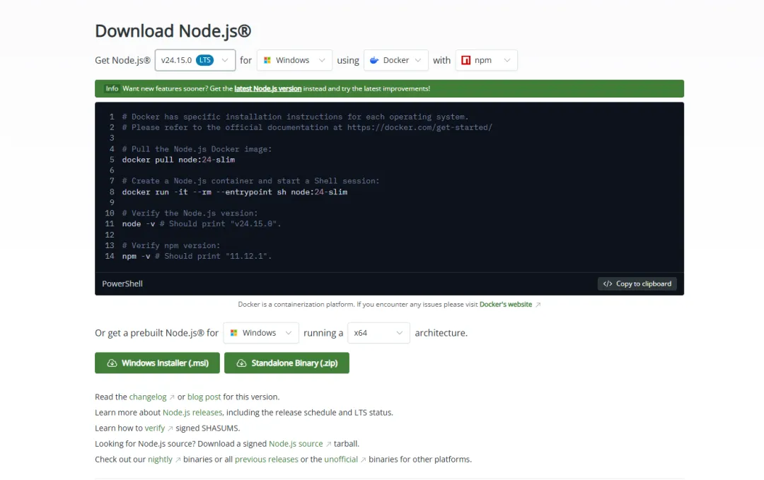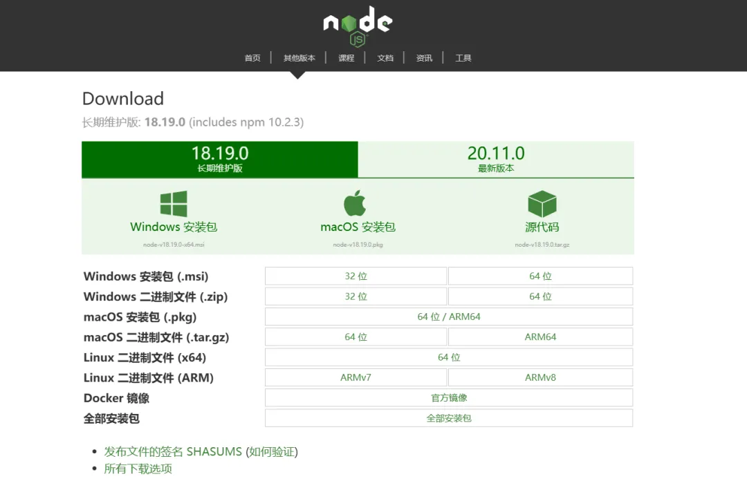1)进入下载页,选择需要的版本下载(建议选择“长期稳定版(LTS)”)。