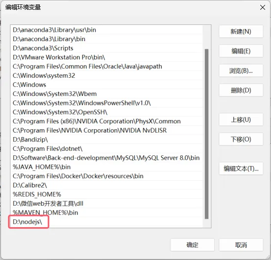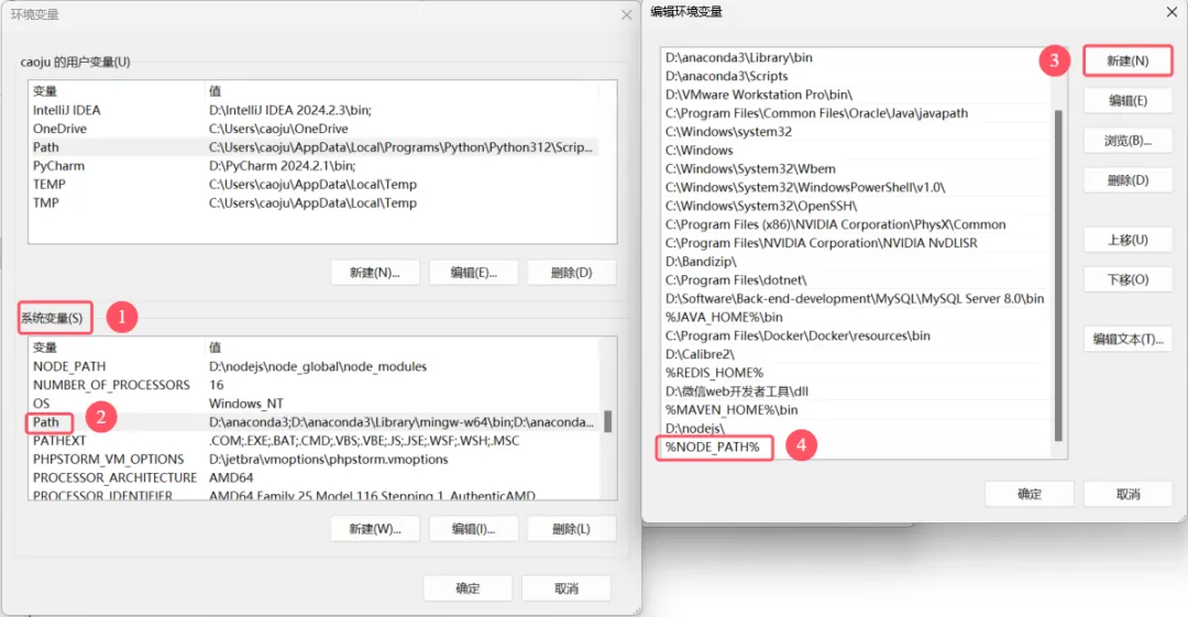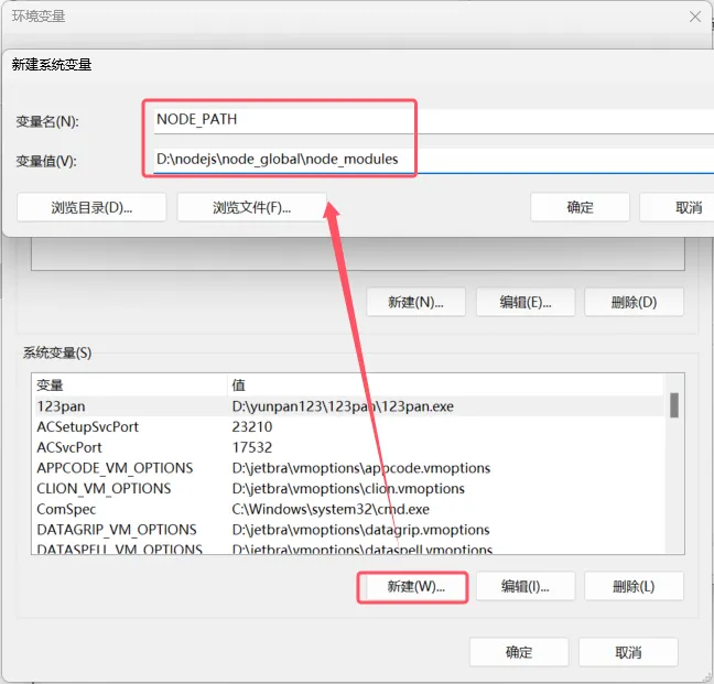 5)打开“系统变量”中的Path,新建%NODE_PATH%。