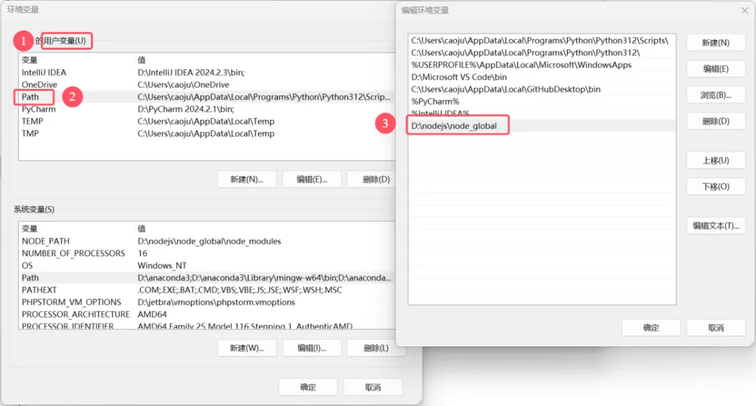 4)打开“用户变量”中的Path,修改C:\Users\caoju\AppData\Roaming\npm为D:\nodejs\node_global(自己的node_global位置)