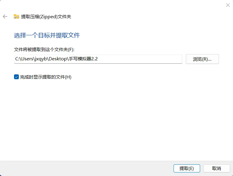 2.1,鼠标右击【手写模拟器2.2】压缩包(Win11系统需先点击“显示更多选项”)选择【全部解压缩】。如下图:
