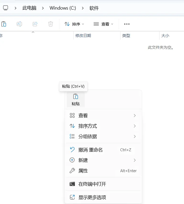 2.4,打开需要安装的磁盘【如C盘】,鼠标右击空白处点击【粘贴】。