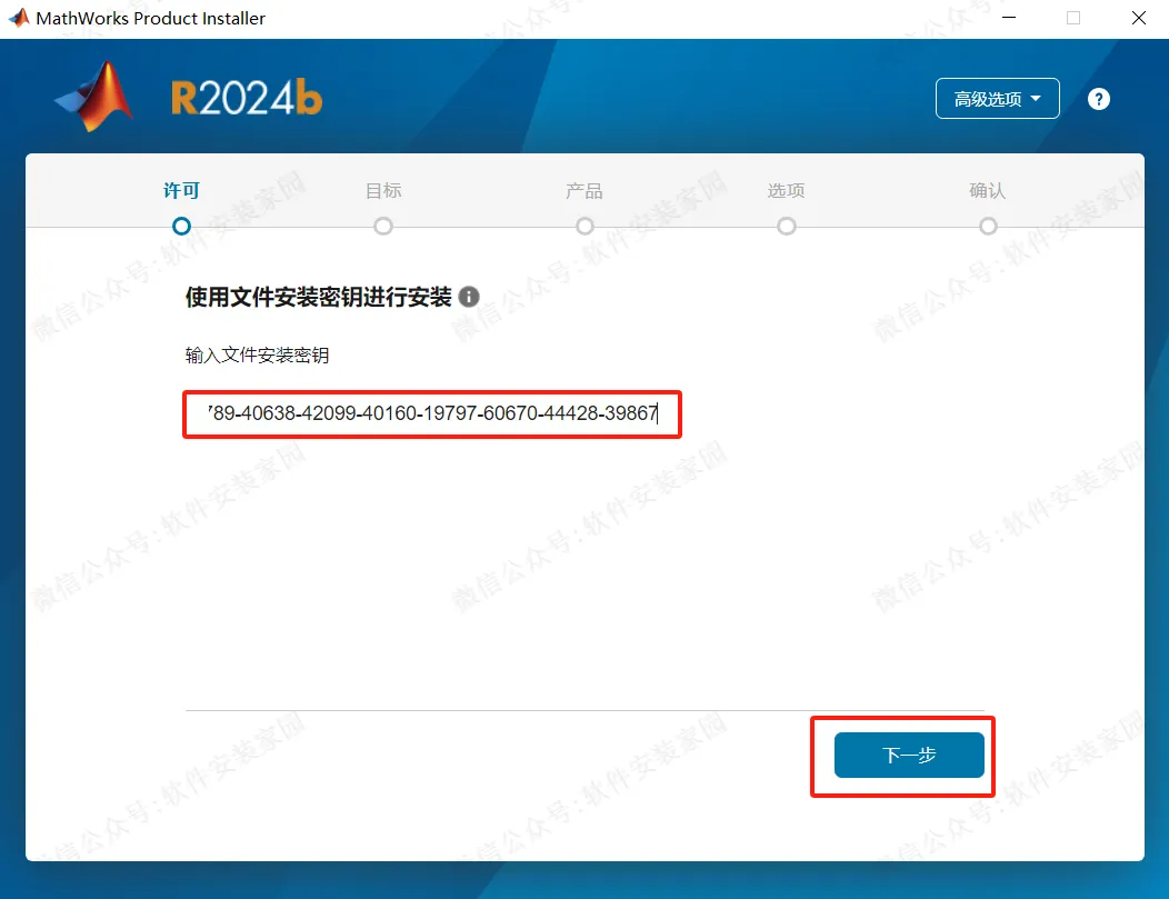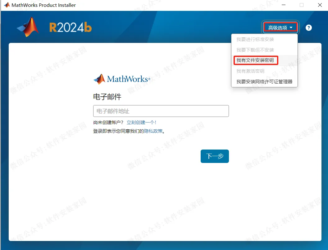 5、点击“高级选项”,选择“我有文件安装密钥”
