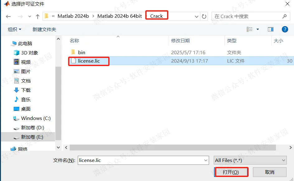 9、在解压后的文件夹Matlab 2024b文件夹中的【Crack】文件夹,选中license.lic文件,点击“打开”