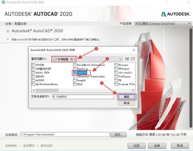 6、我这里改到在D盘,要新建一个【CAD2020】文件夹,选中后点击【确定】。