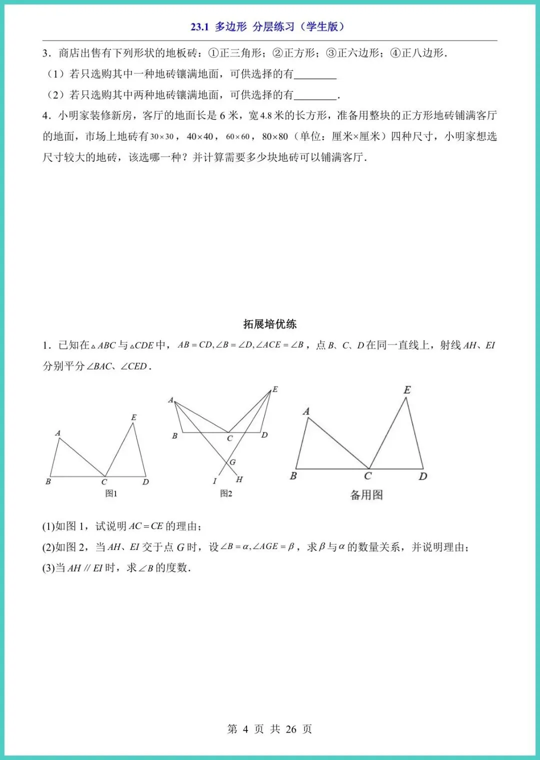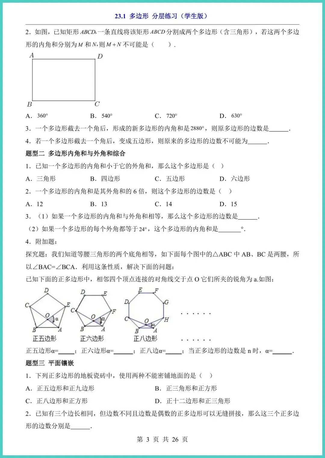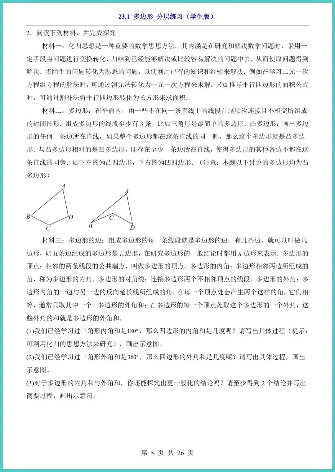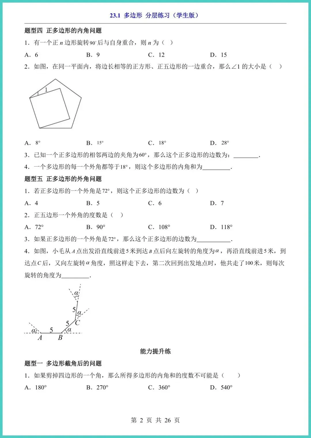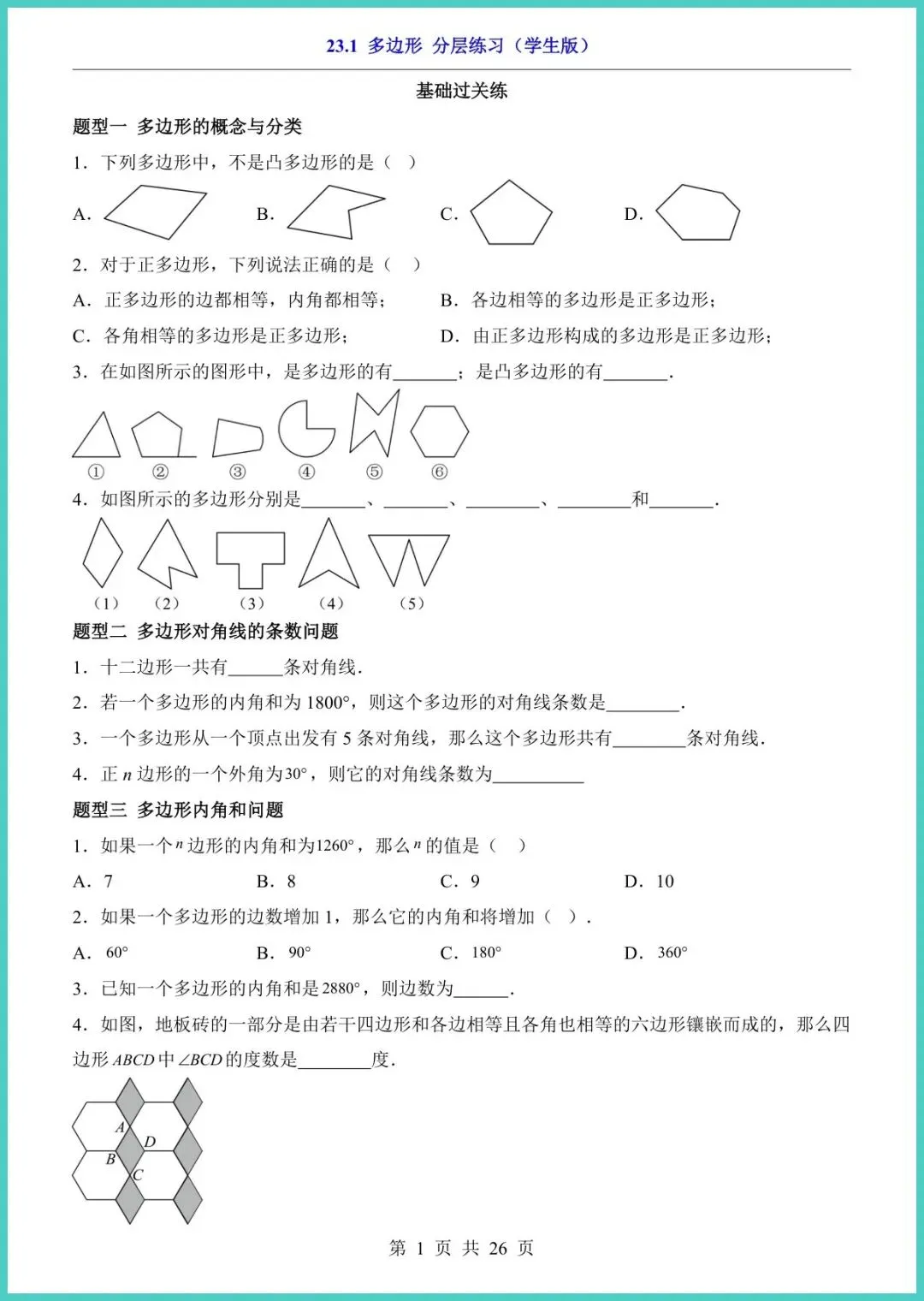 26年沪教五四版八年级下册《23.1多边形分层练习》,26页全彩电子版,专为春季学期打造!资料按“基础—提升—冲刺”三层设计,每页配思路点拨易错警示拓展探究,让孩子从“听得懂”到“做得快”。精选校真题、竞赛改编题,手把手训练“数边、算角、证全等”核心考点,一周吃透多边形。现在打印,刚好赶上学校月考,家长别等,速存速练,娃的满分就在这一叠纸里!