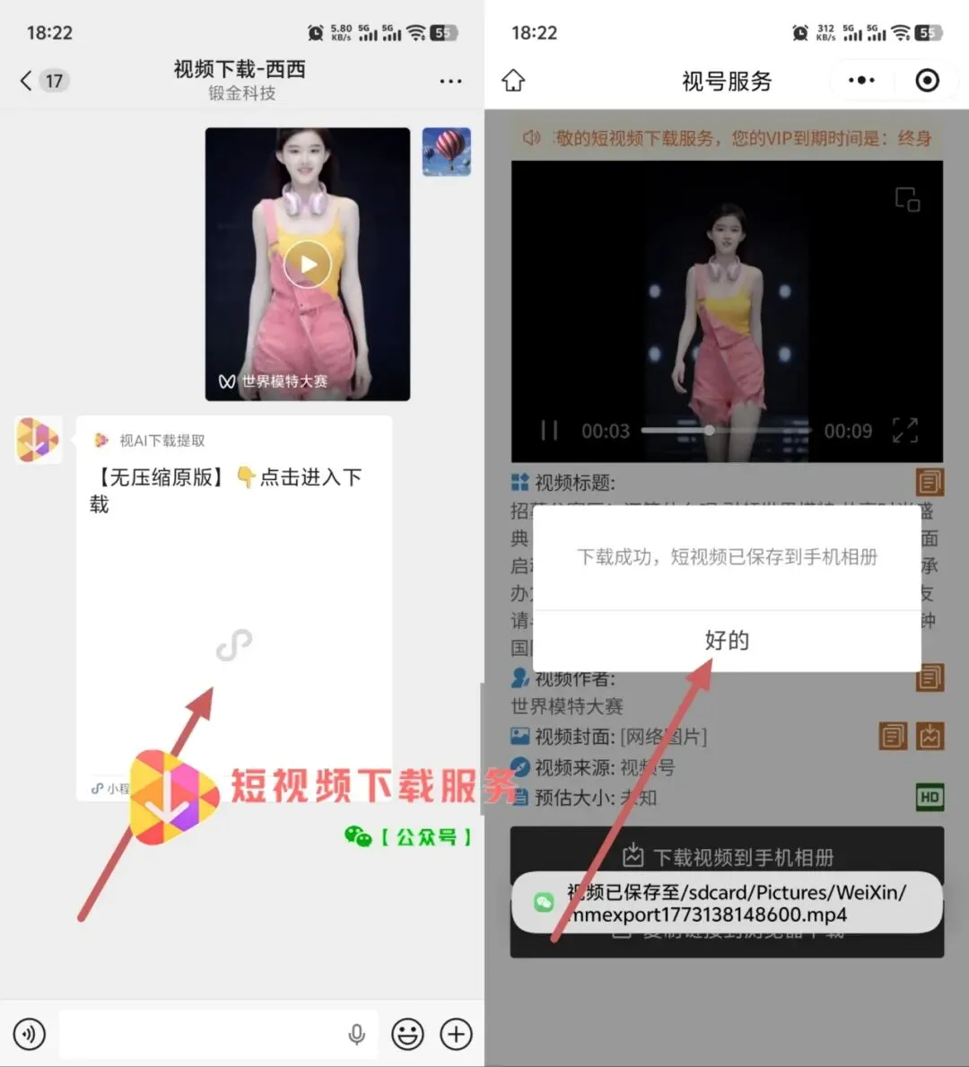 2、视频下载客服机器人会自动解析并返回下载小程序 → 进入小程序 、 一键下载到手机相册!