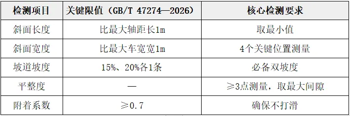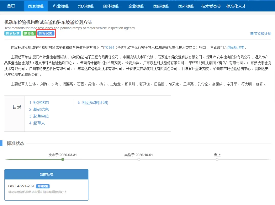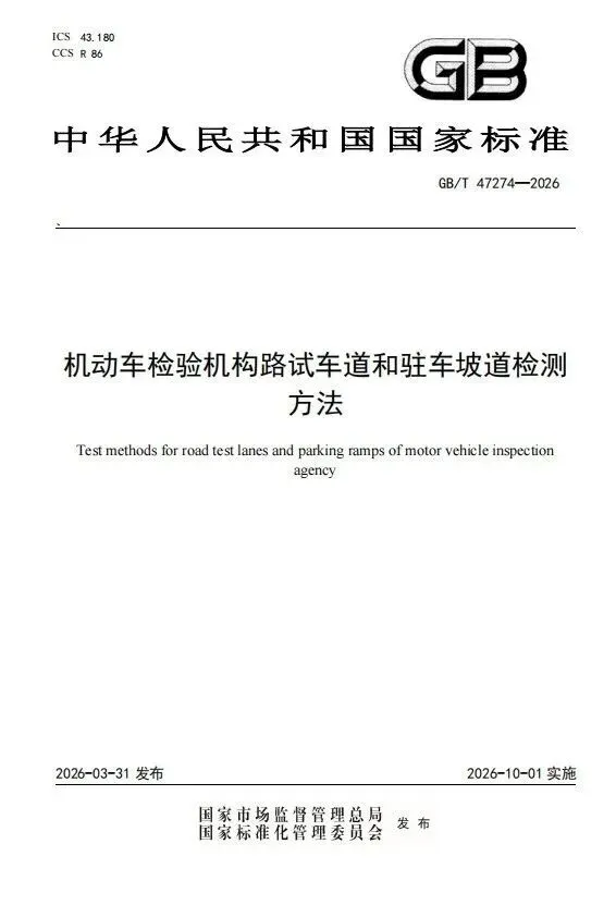 近日,国家标准GB/T 47274-2026《机动车检验机构路试车道和驻车坡道检测方法》正式批准发布,将于2026年10月1日起正式实施。标志着国内机动车检验机构路试车道、驻车坡道的建设、验收与日常检测,终于有了全国统一规范口径,彻底结束各地执行标准不统一、验收依据碎片化的行业现状。