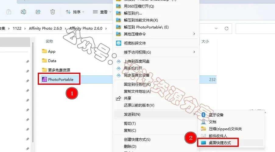 1、下载Affinity Photo2.6.0软件安装包到电脑上,右键选择【解压到解压到当前文件夹】。2、找到【Photo Portable】应用程序,右键依次点击【显示更多选项】、【发送到】、【桌面快捷方式】,完成软件桌面快捷方式的创建3、回到桌面,右键桌面上的【PhotoPortable软件图标】,再点击【打开】6、以上就是Affinity Photo 2.6 软件安装的全过程,要是对你有帮助的话,请为小编点个赞!