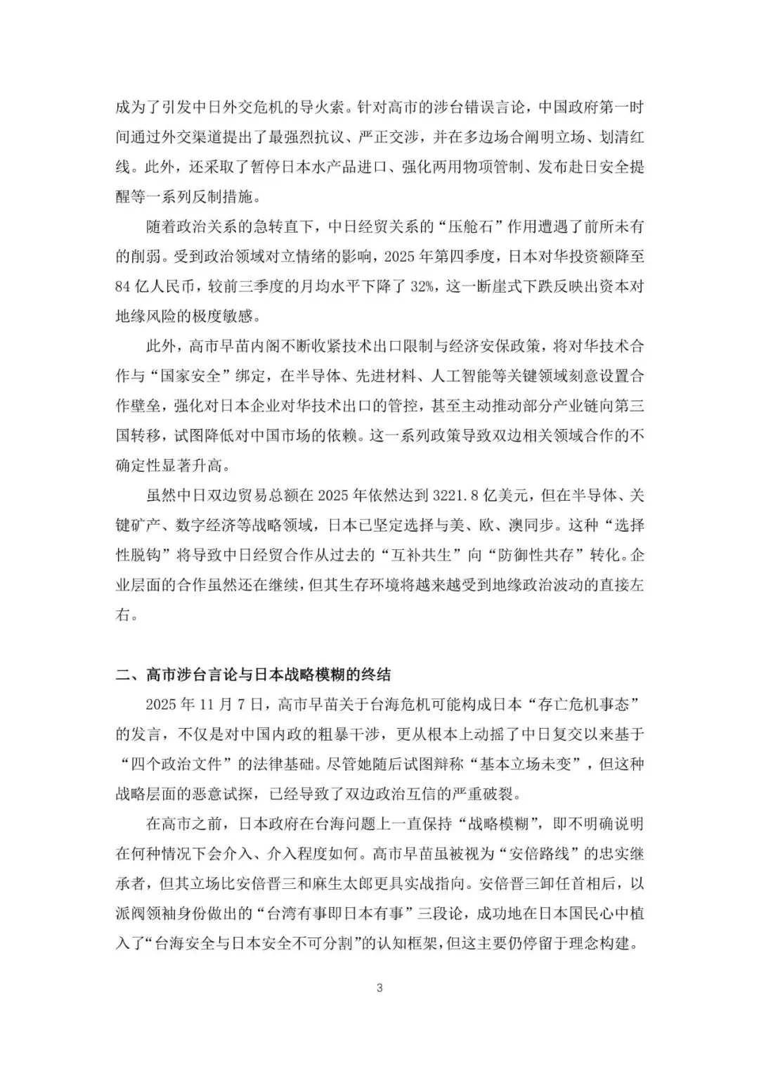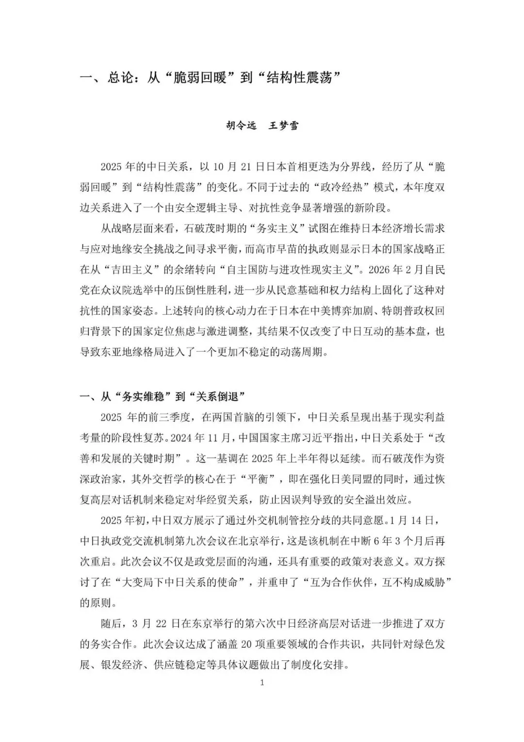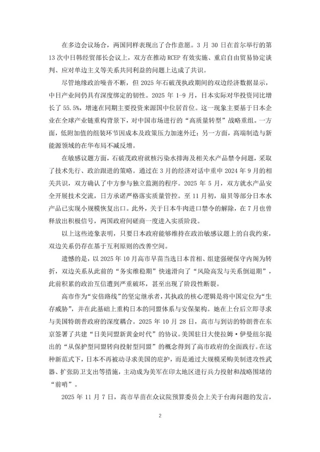 2025 年的中日关系,以 10 月 21 日日本首相更迭为分界线,经历了从“脆弱回暖”到“结构性震荡”的变化。不同于过去的“政冷经热”模式,本年度双边关系进入了一个由安全逻辑主导、对抗性竞争显著增强的新阶段。