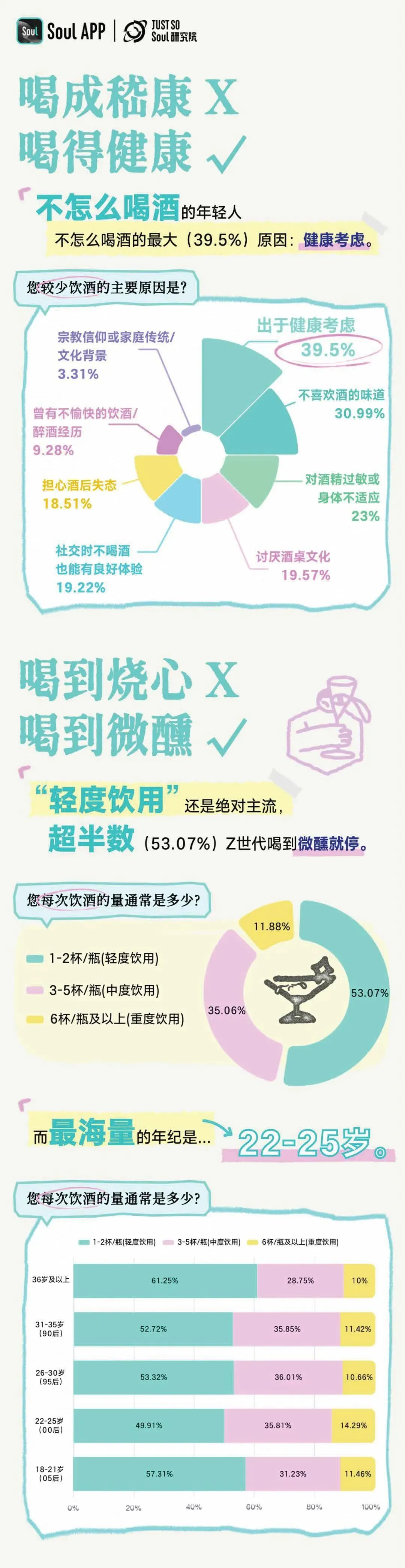 Z世代中八成有过饮酒经历,但频繁大量饮用者较少,饮酒频率因城市级别而异,北上广深“酒精浓度”最高。健康考虑是不怎么喝酒的最大原因,占比39.5%,超半数Z世代选择“轻度饮用”,喝到微醺即止,最常饮酒的年龄段为22-25岁。缓解压力、放松心情是Z世代饮酒的主要动机,同时社交需求和庆祝纪念也是重要原因。