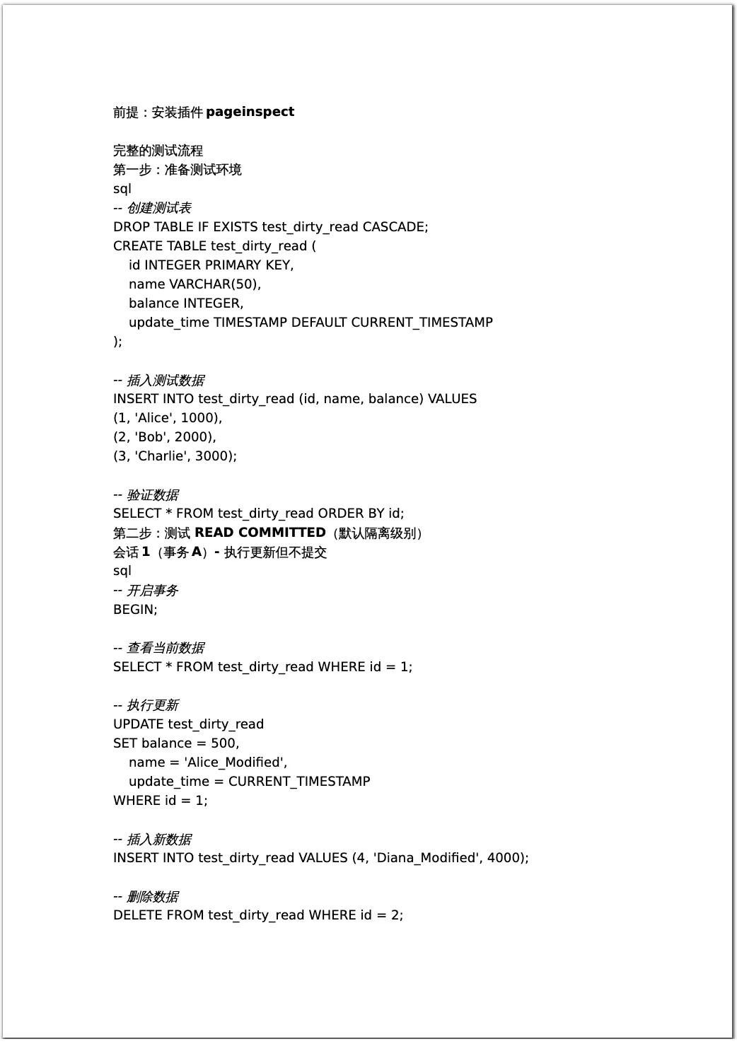 今天推荐的是墨天轮用户上传的《PostgreSQL脏读测试》文档,全文共7页,通过完整可复现的测试流程,从建表、多会话操作到底层数据页校验,清晰验证了 PostgreSQL 在不同事务隔离级别下的脏读表现。