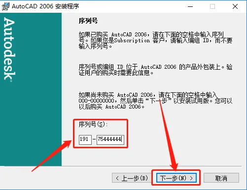 6.输入序列号:191-75444444,然后点击【下一步】。