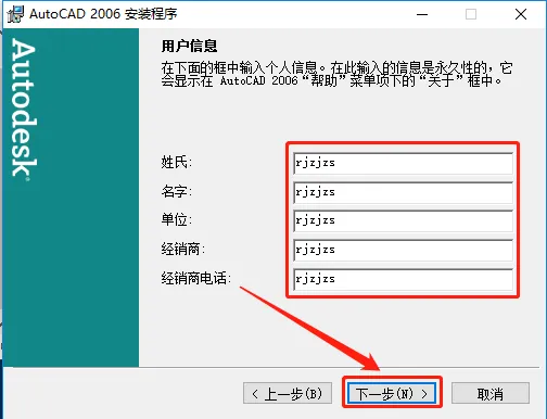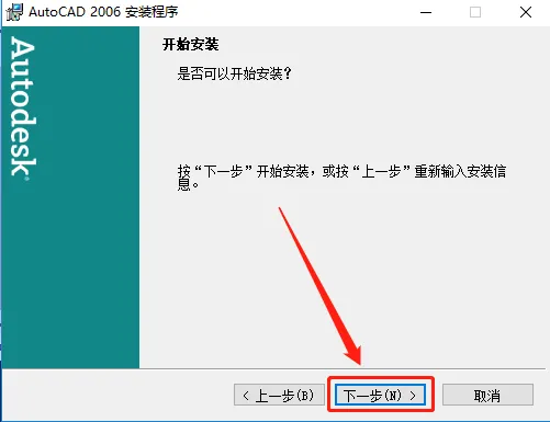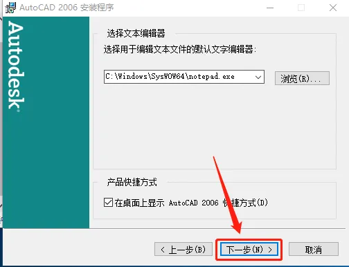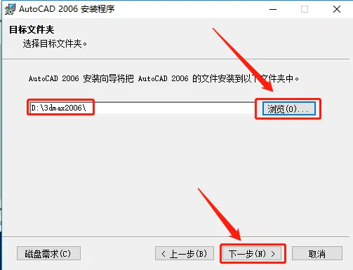 10.点击【浏览】更改安装路径,不建议安装路径为C盘,我这里选择安装到D盘,并在D盘创建了一个名为CAD2006的文件夹,设置好安装路径后点击【下一步】。