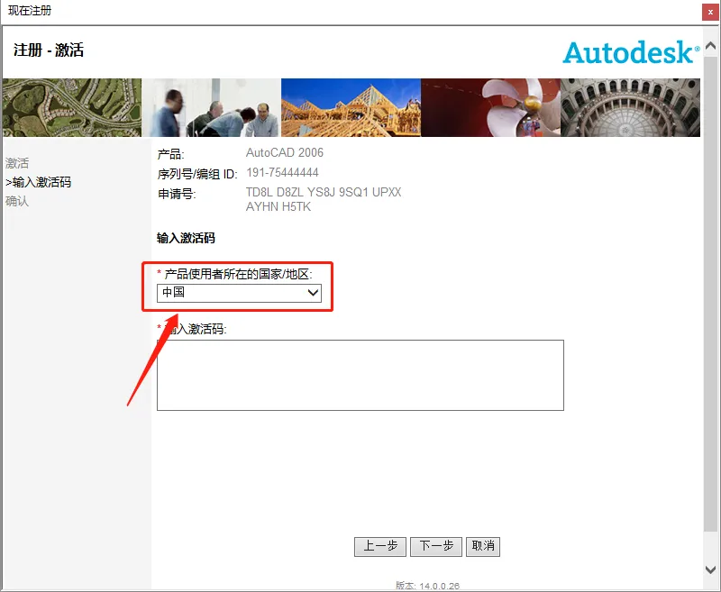 20.使用【Ctrl+C】快捷键复制申请号,然后使用【Ctrl+V】快捷键粘贴至注册机的Request code方框中,接下来【Ctrl+C】快捷键复制Activation code方框中生成的激活码,然后使用【Ctrl+V】快捷键粘贴至软件的激活码处,粘贴好激活码后点击【下一步】。