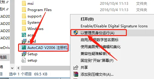 19.返回到解压的文件夹,鼠标右击AutoCAD V2006注册机,选择【以管理员身份运行】。