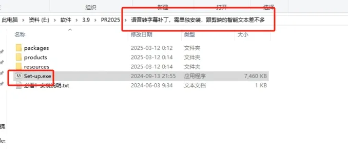 7. 去语音转字幕补丁文件夹,找到里面的setup,继续管理员身份运行。这个是很多PR使用者头疼的问题,有了这个补丁,可以自动根据语音生成字幕,省的去剪映里导一次了。