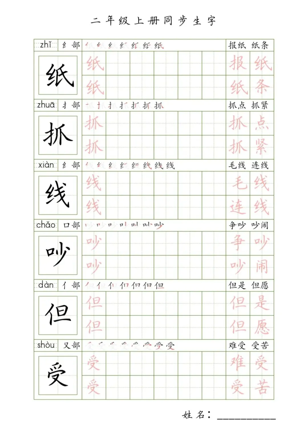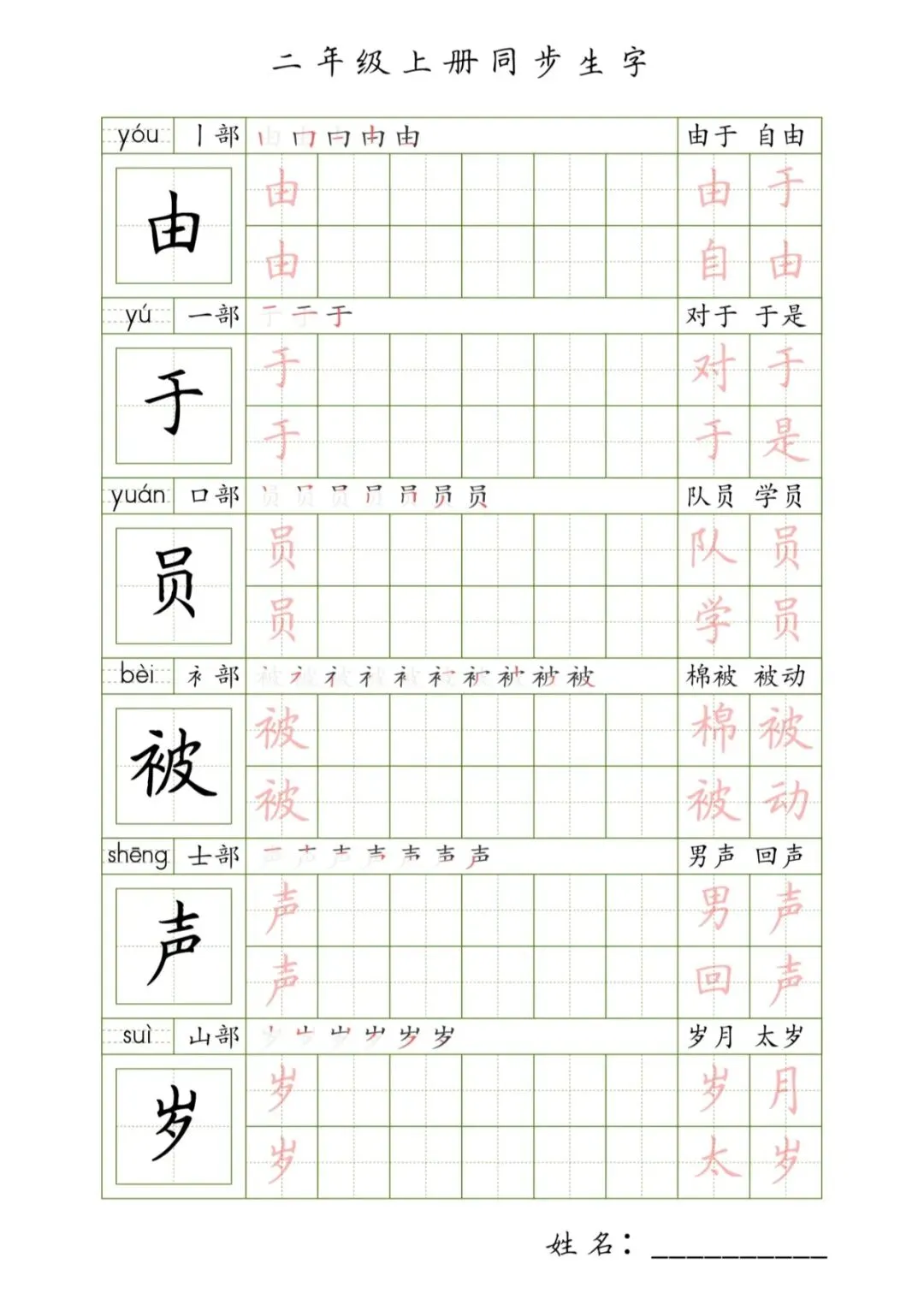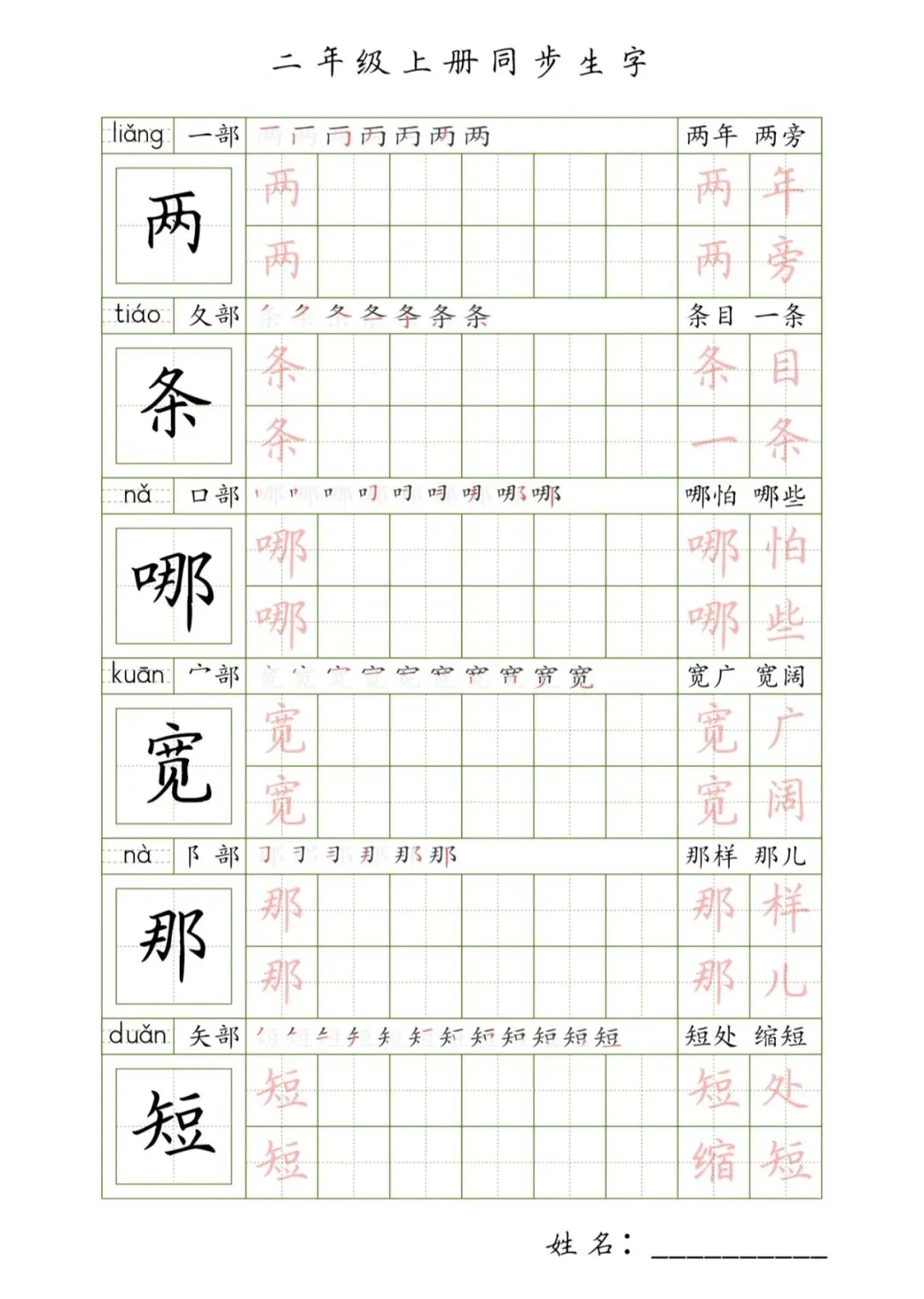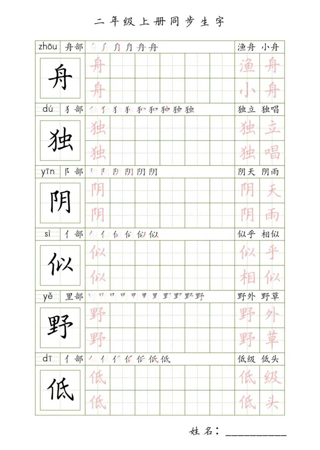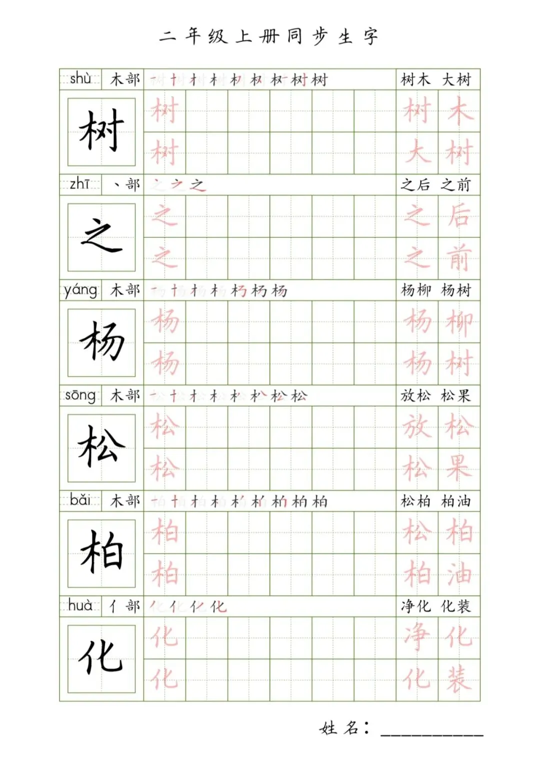 二年级上册同步生字,PDF免费下载
