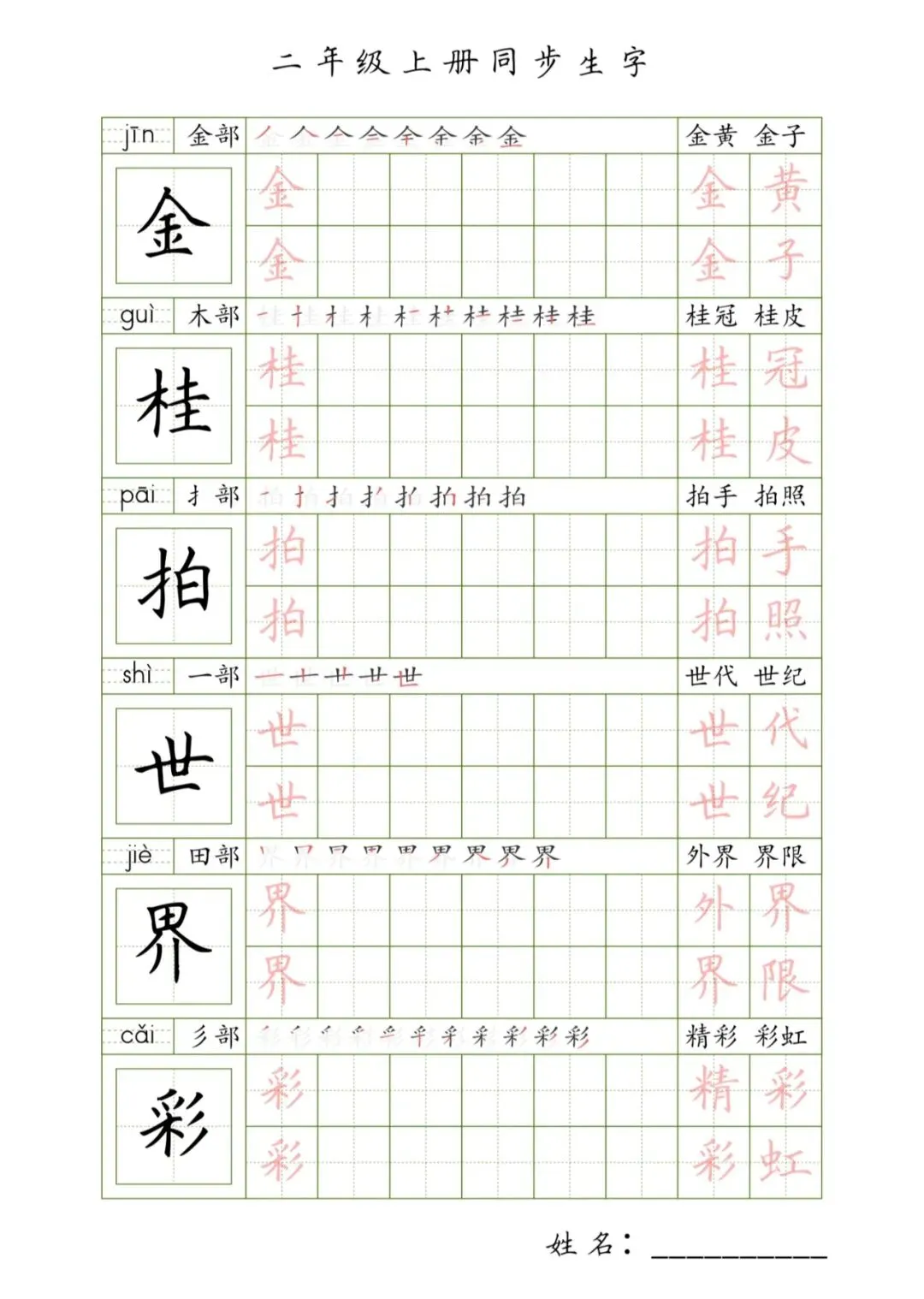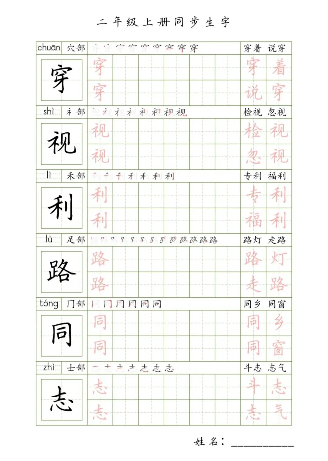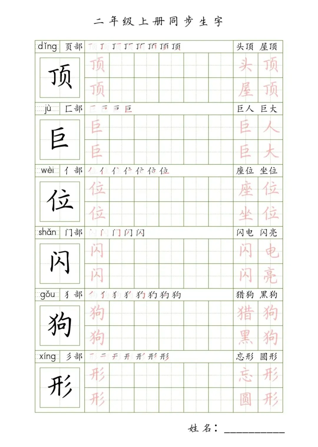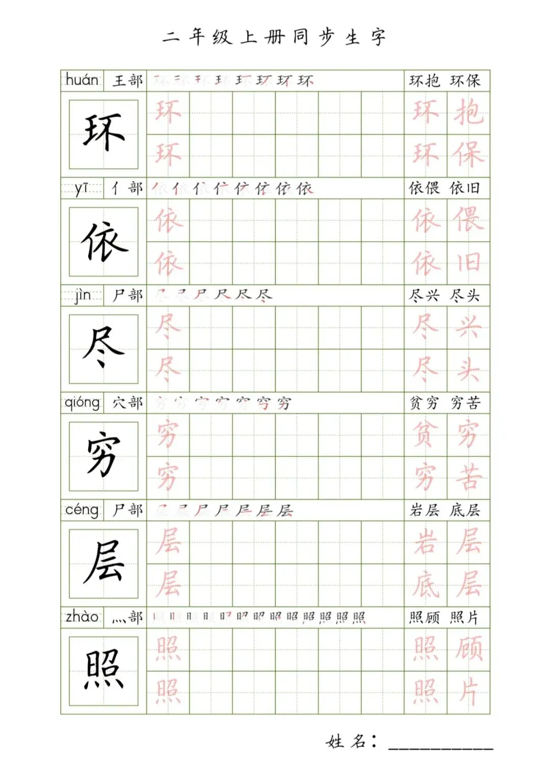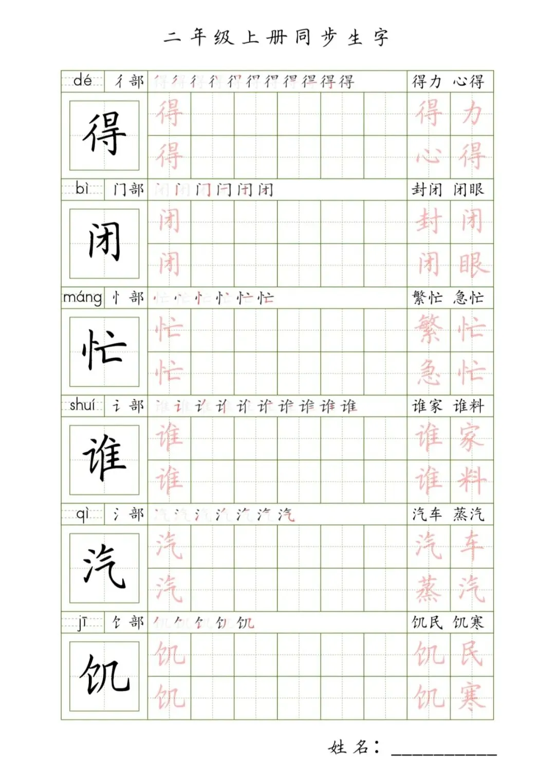 二年级上册同步生字,PDF免费下载