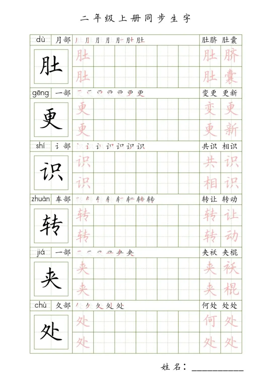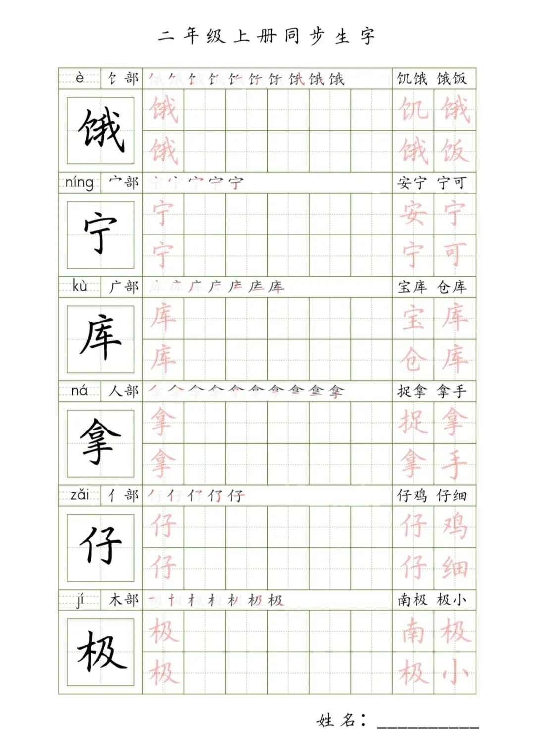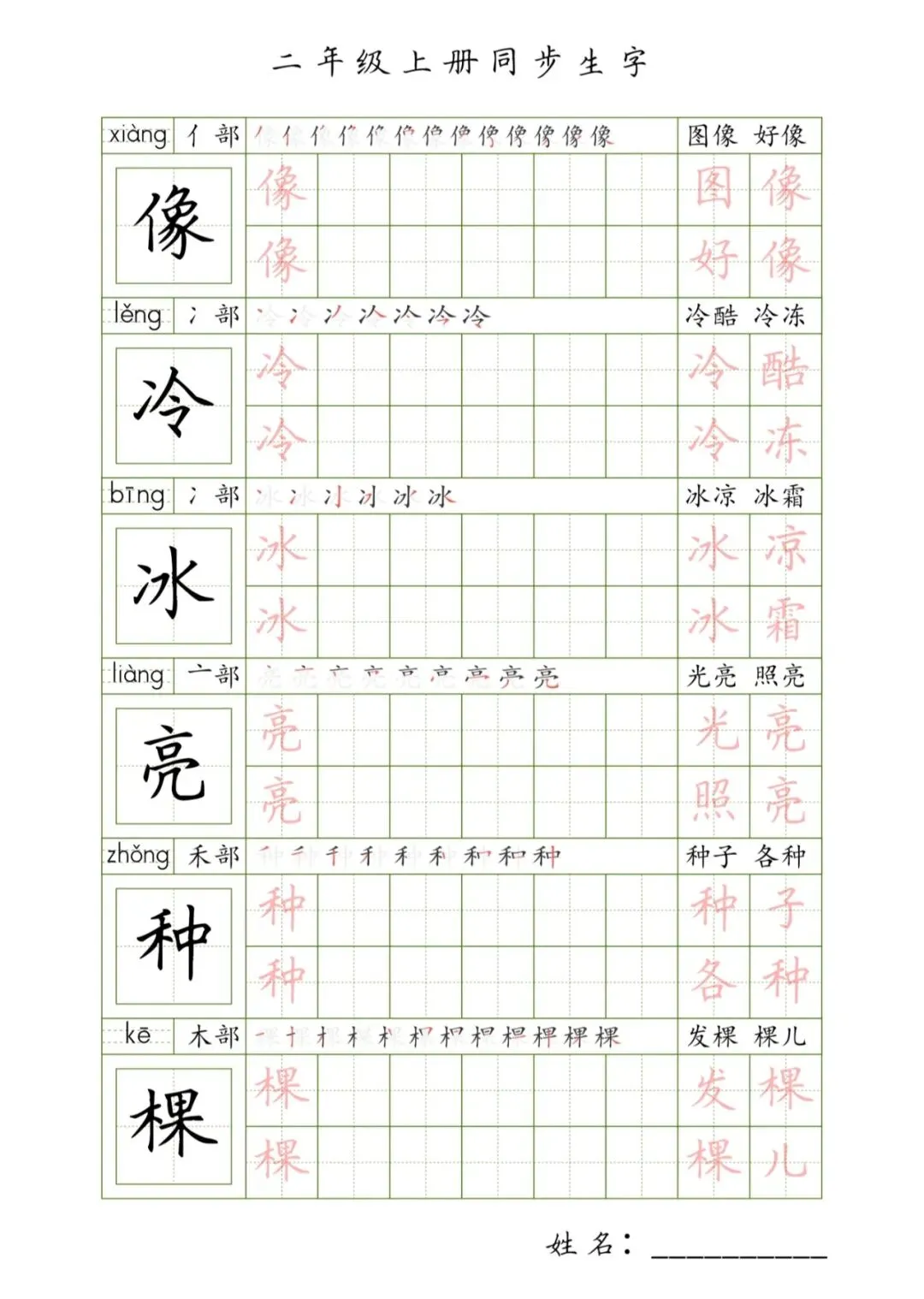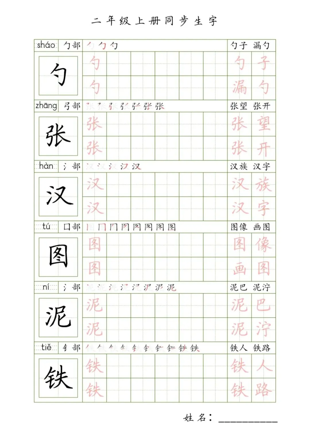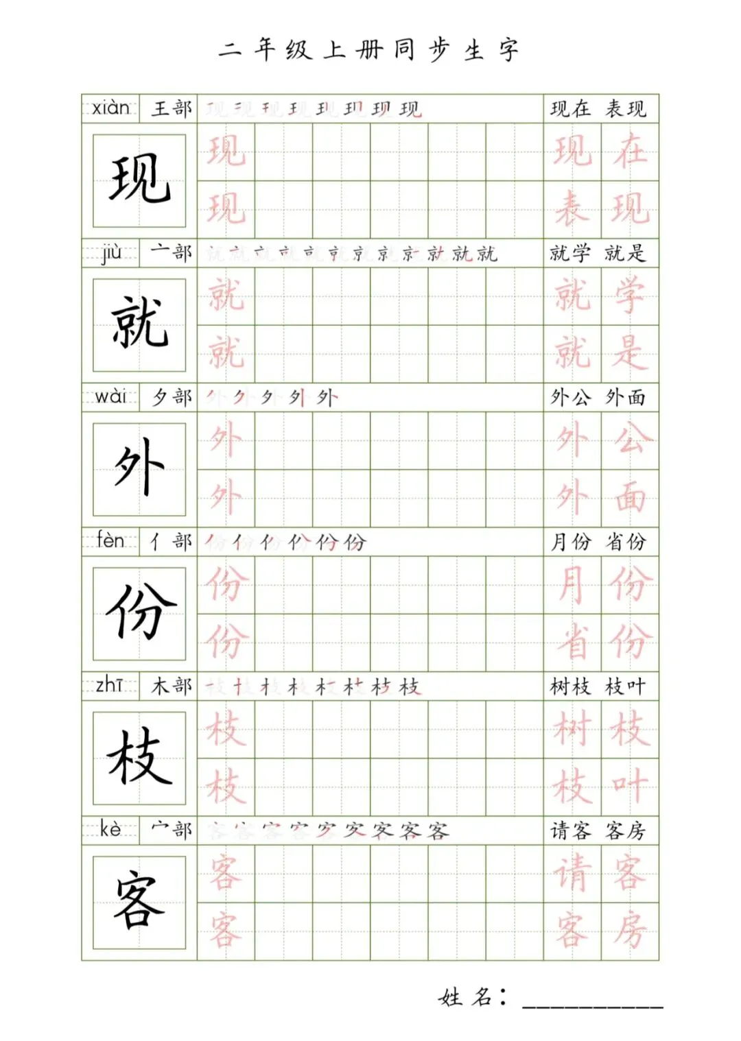 二年级上册同步生字,PDF免费下载
