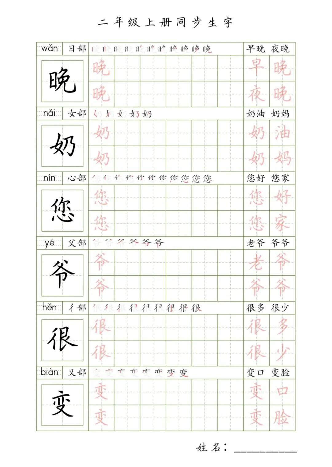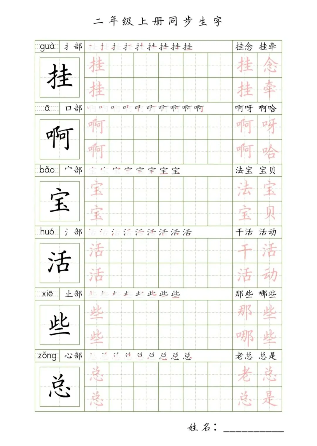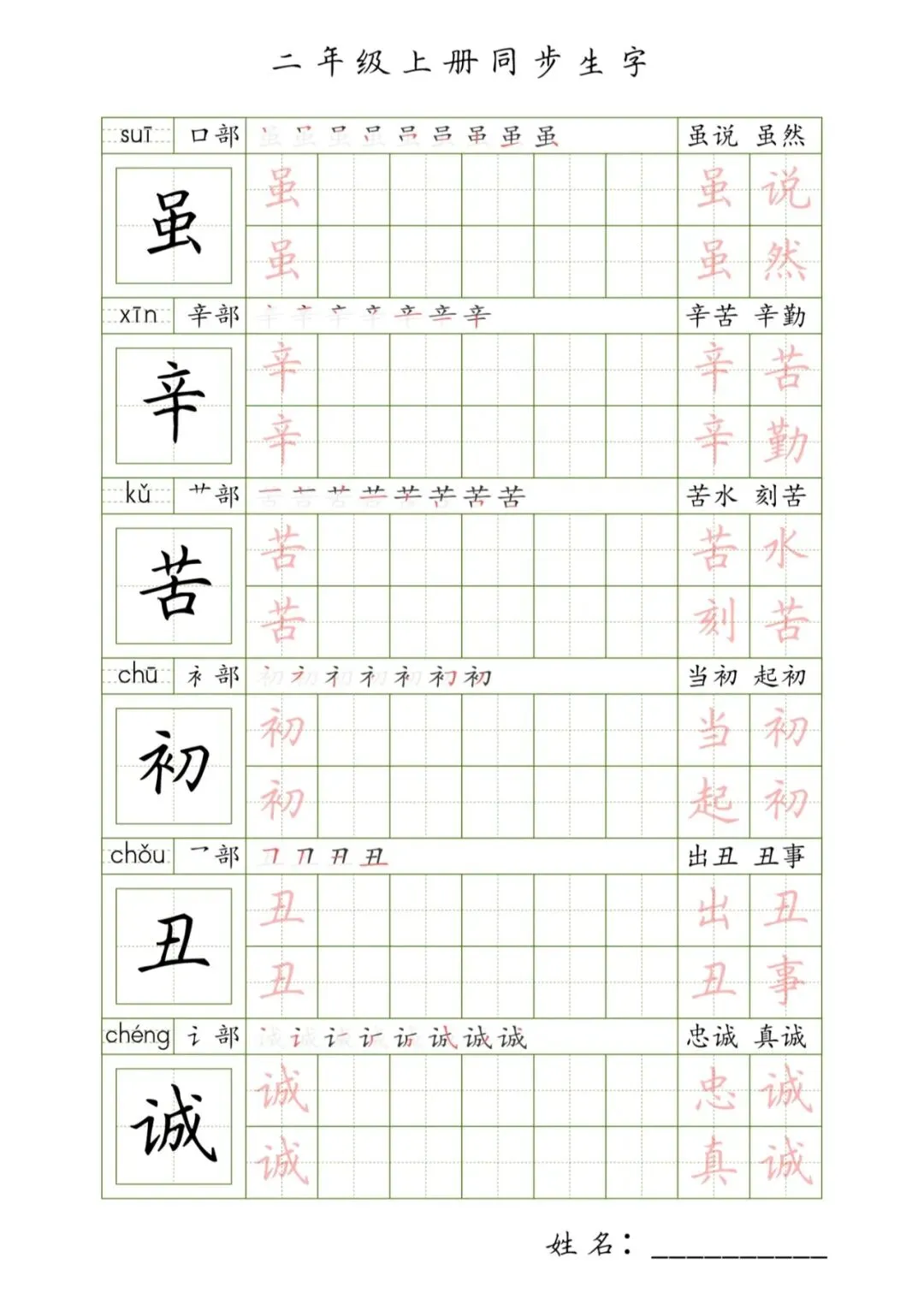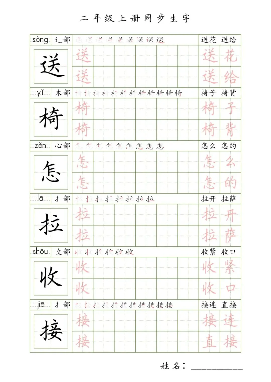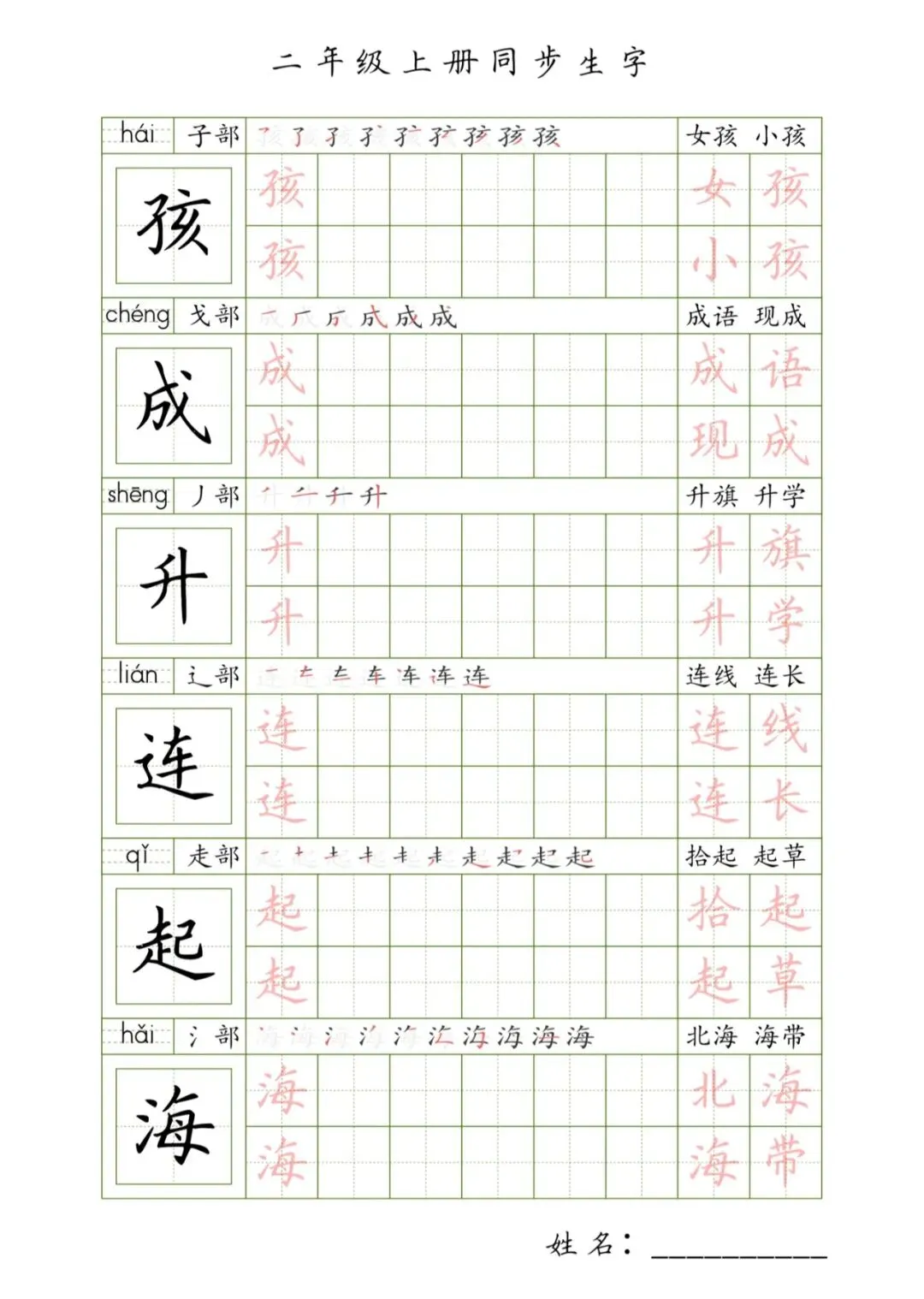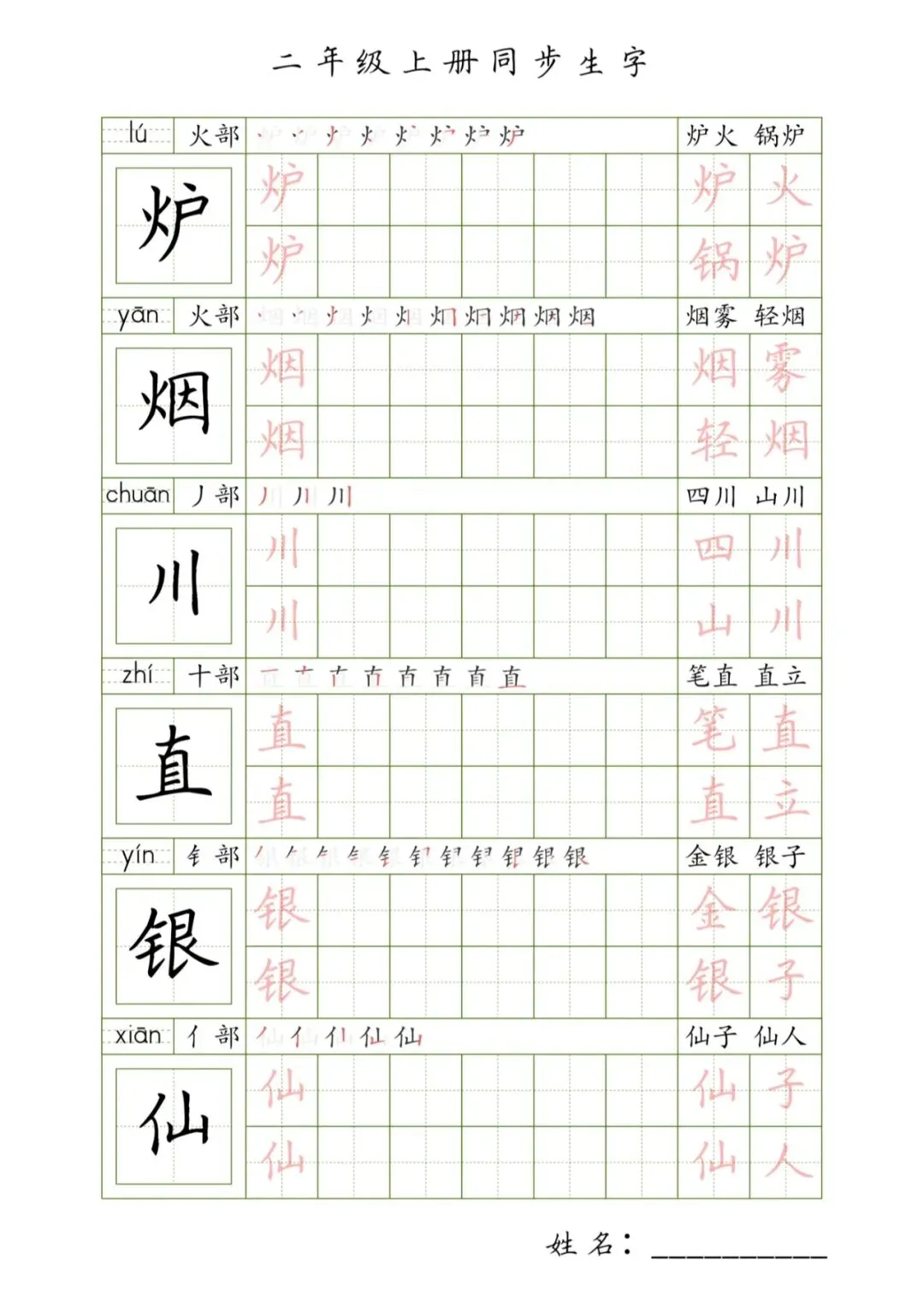 二年级上册同步生字,PDF免费下载