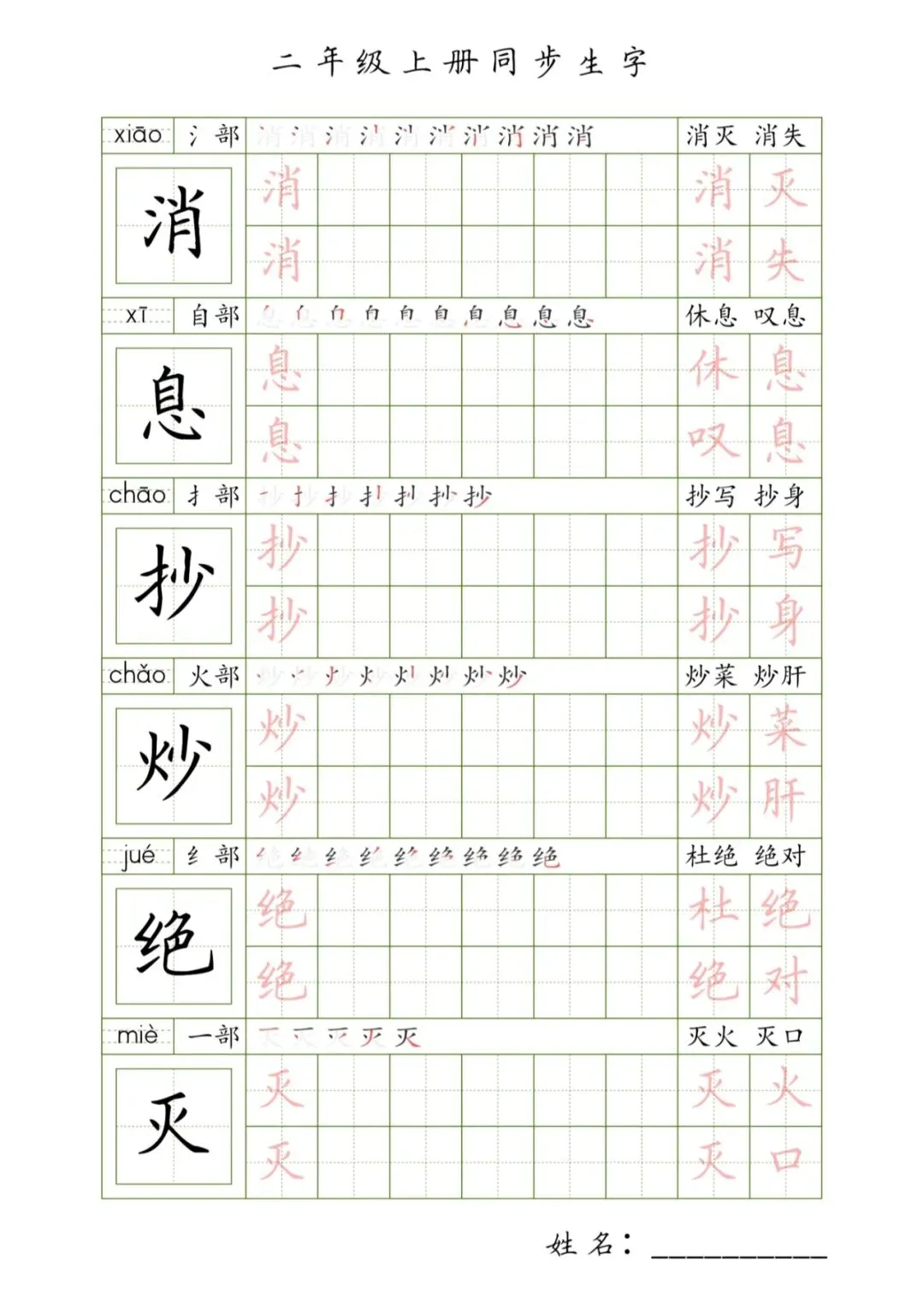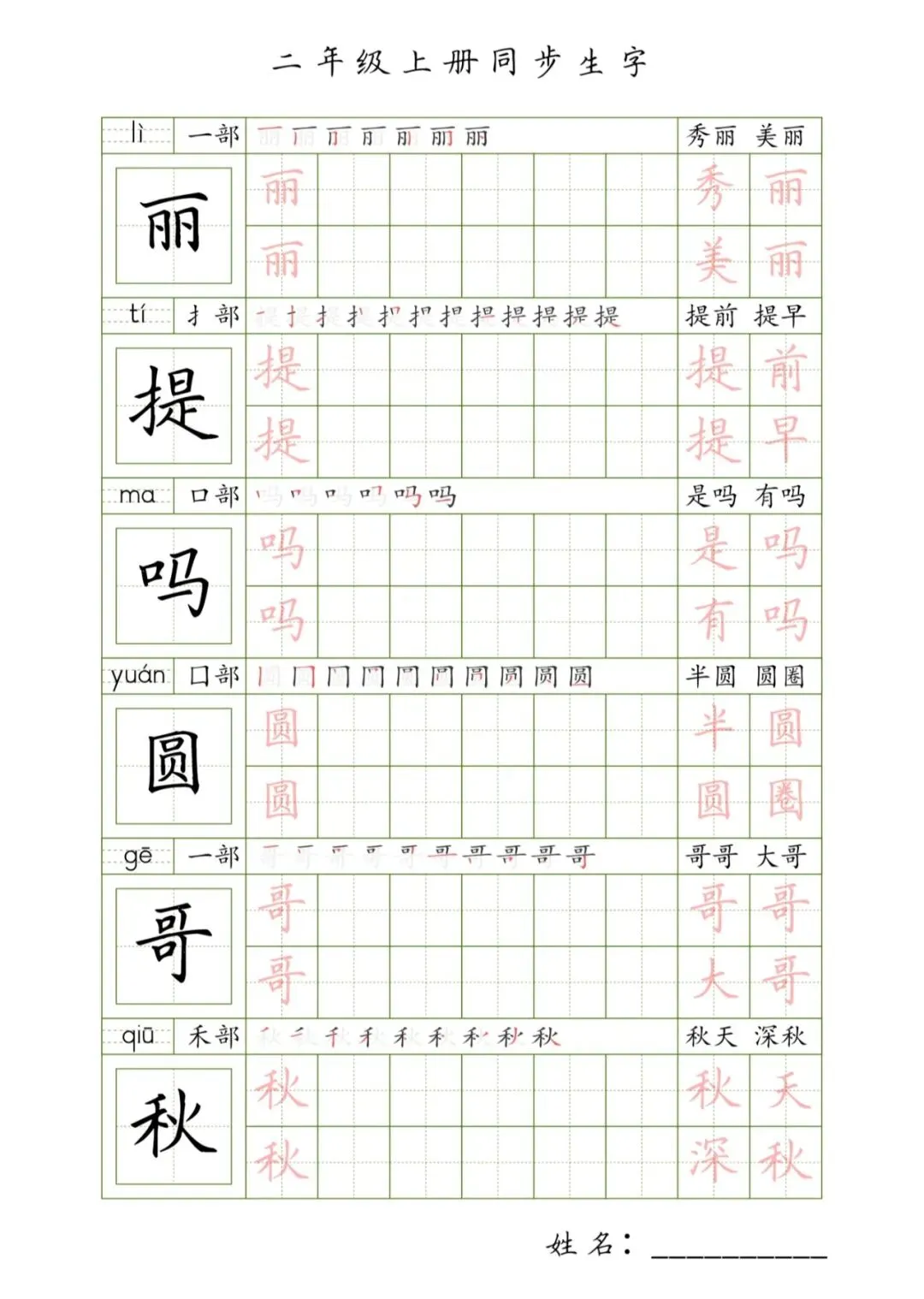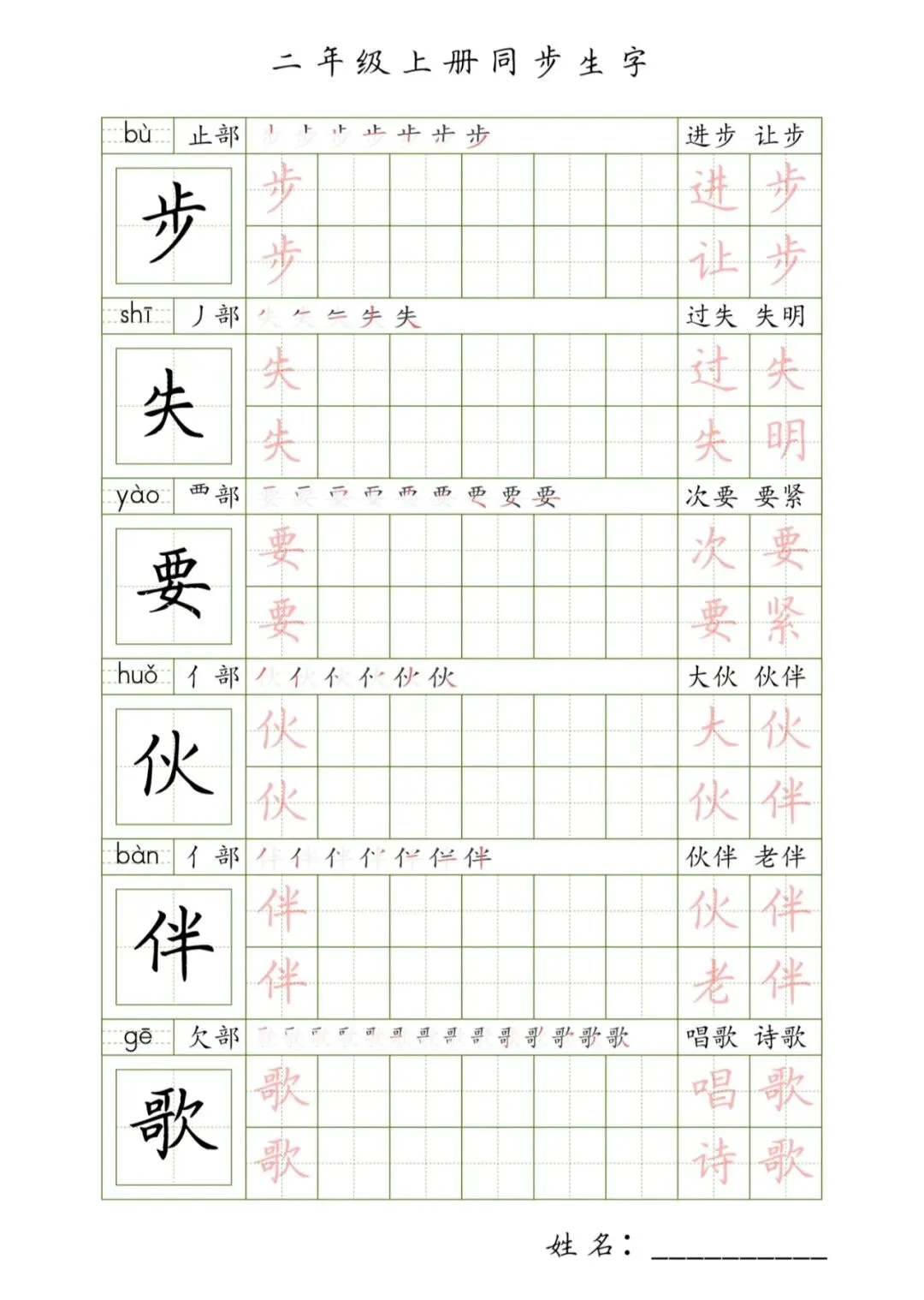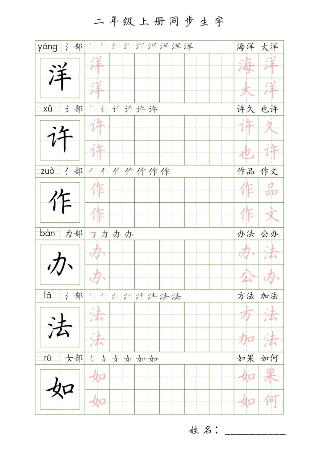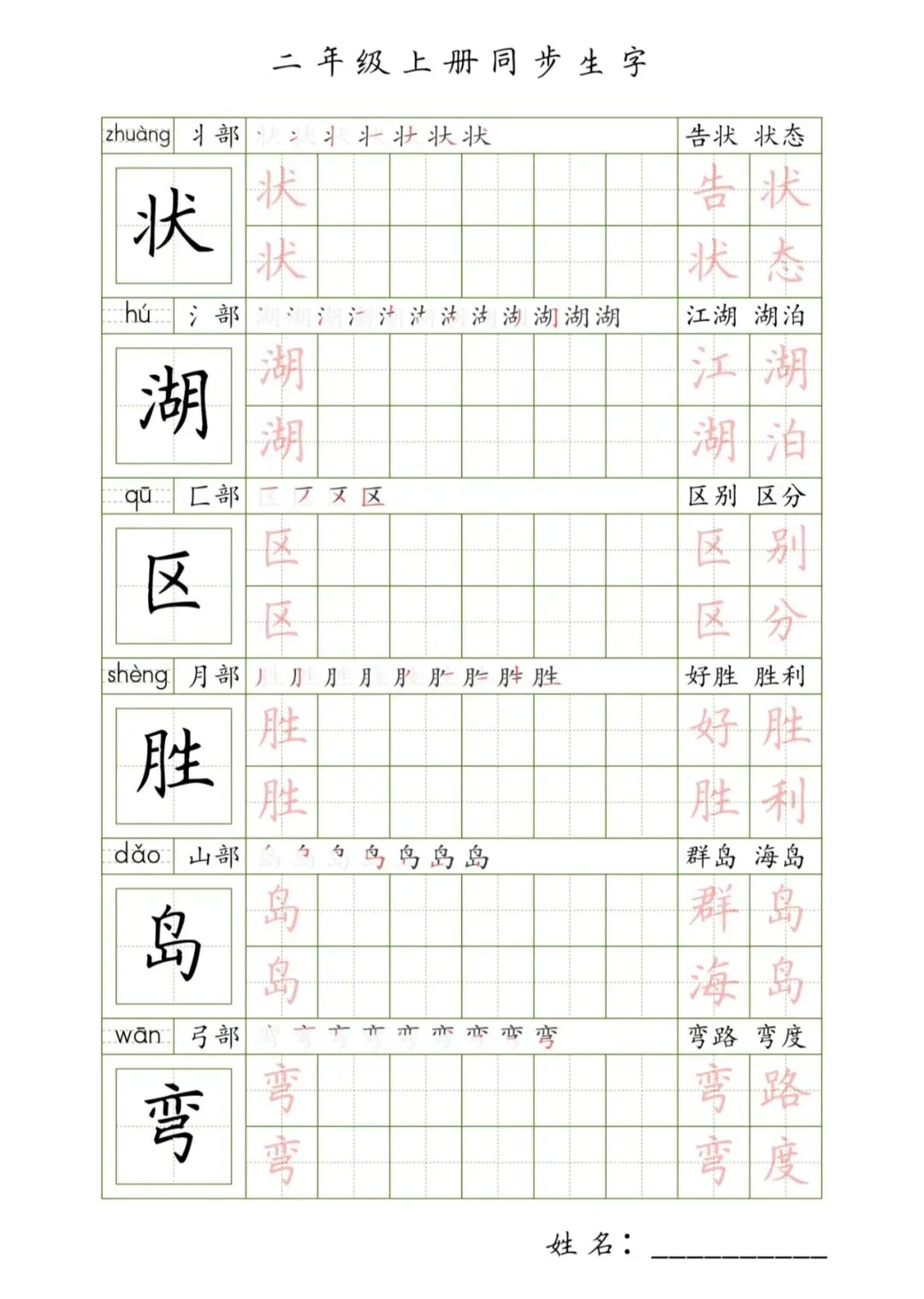 二年级上册同步生字,PDF免费下载