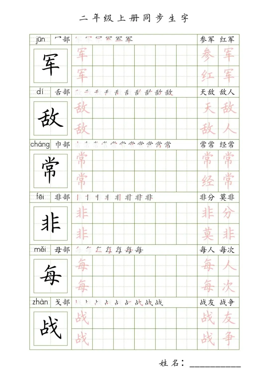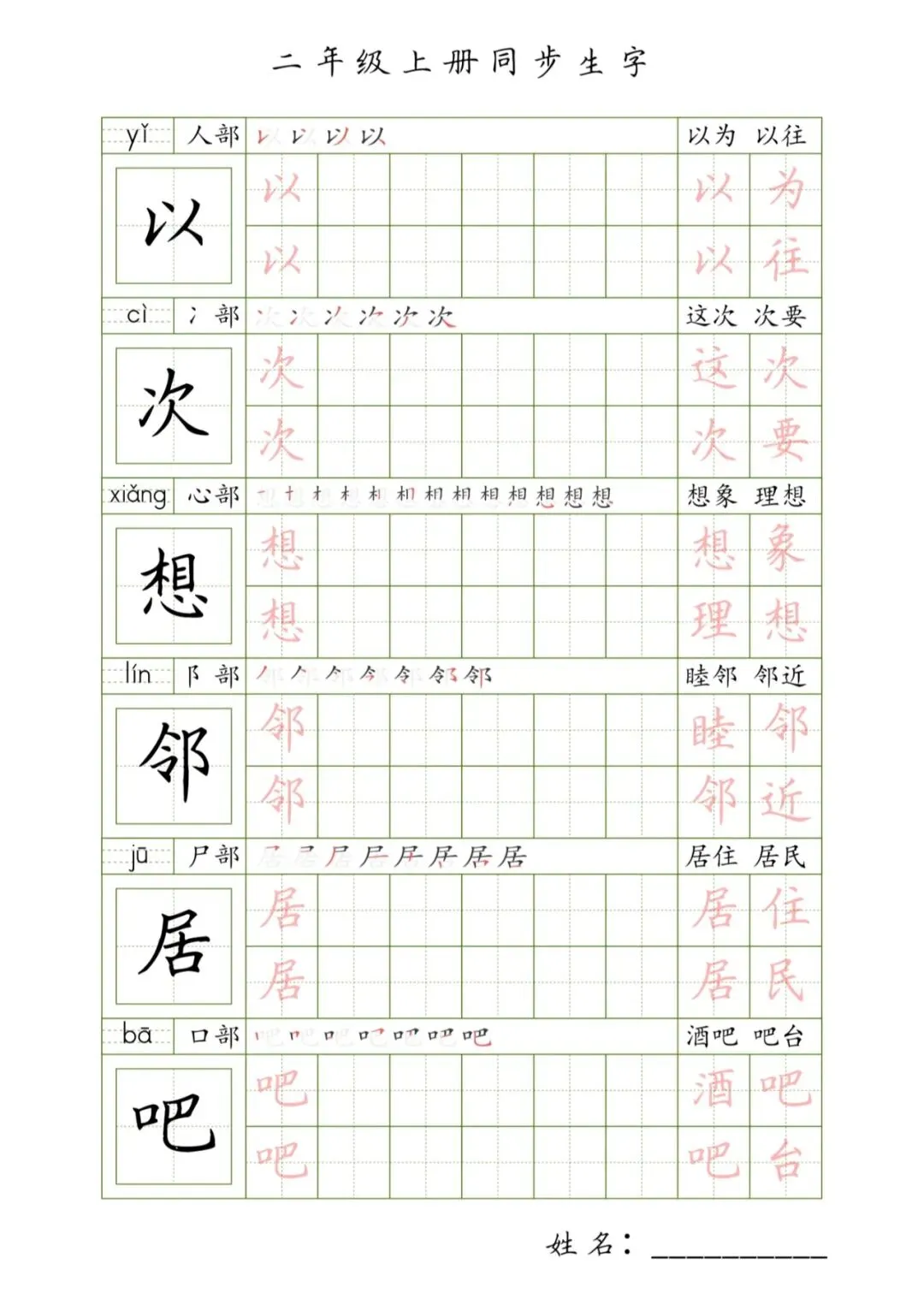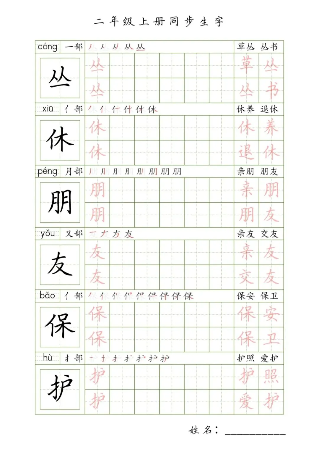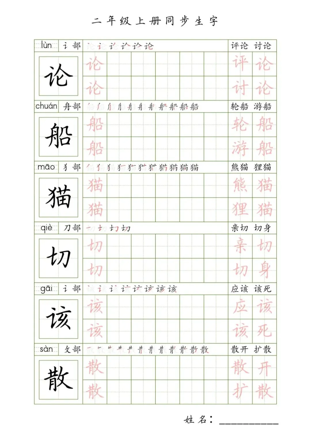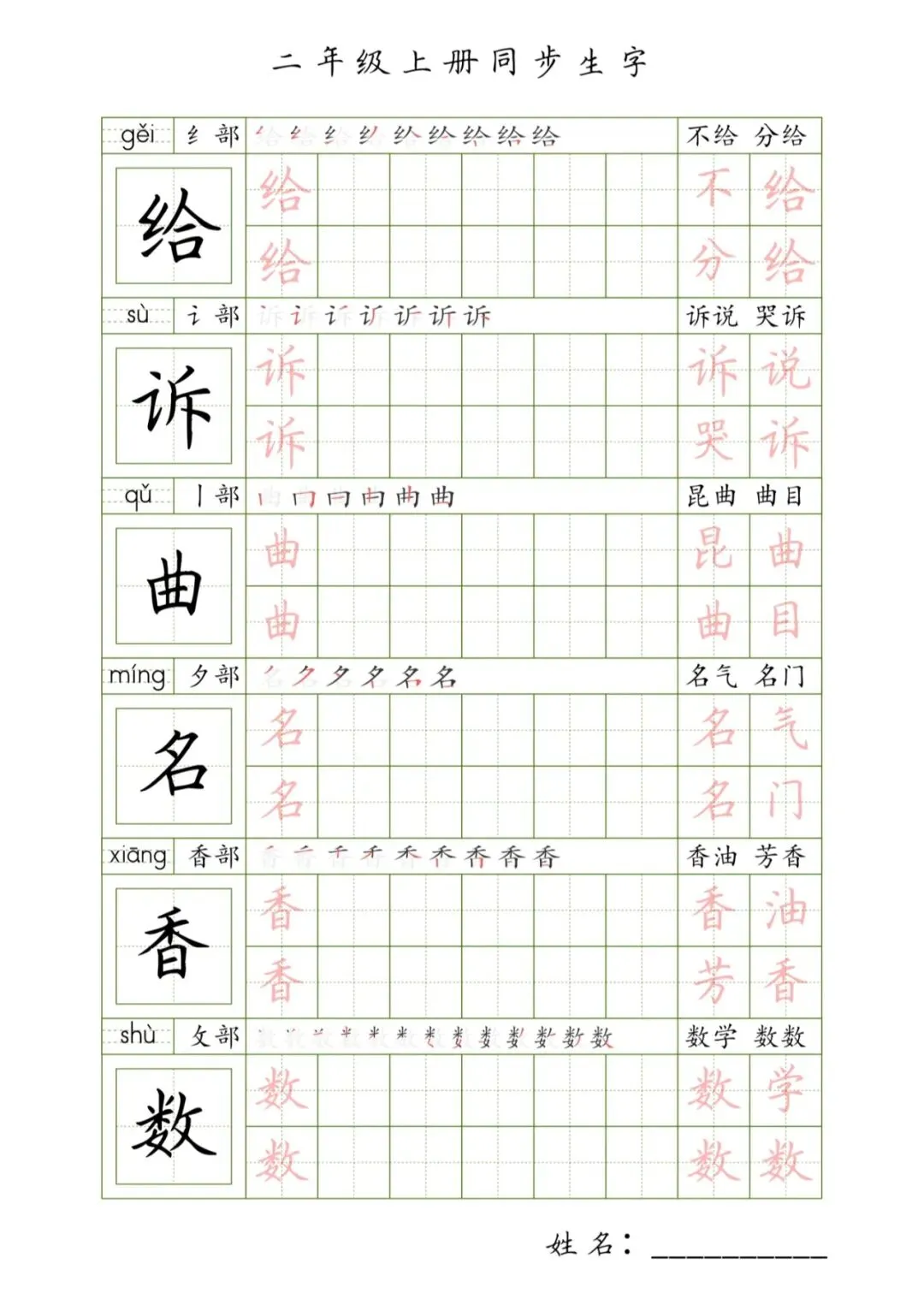 二年级上册同步生字,PDF免费下载