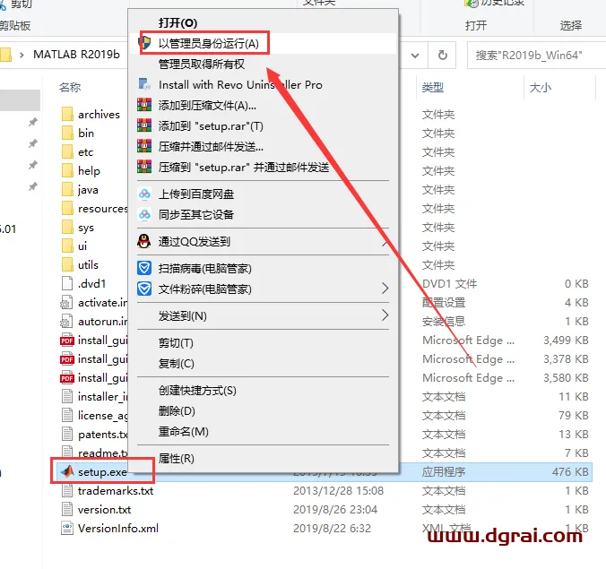 2、打开R2019b_Win64文件夹,选择setup.exe安装程序鼠标右键以管理员身份运行