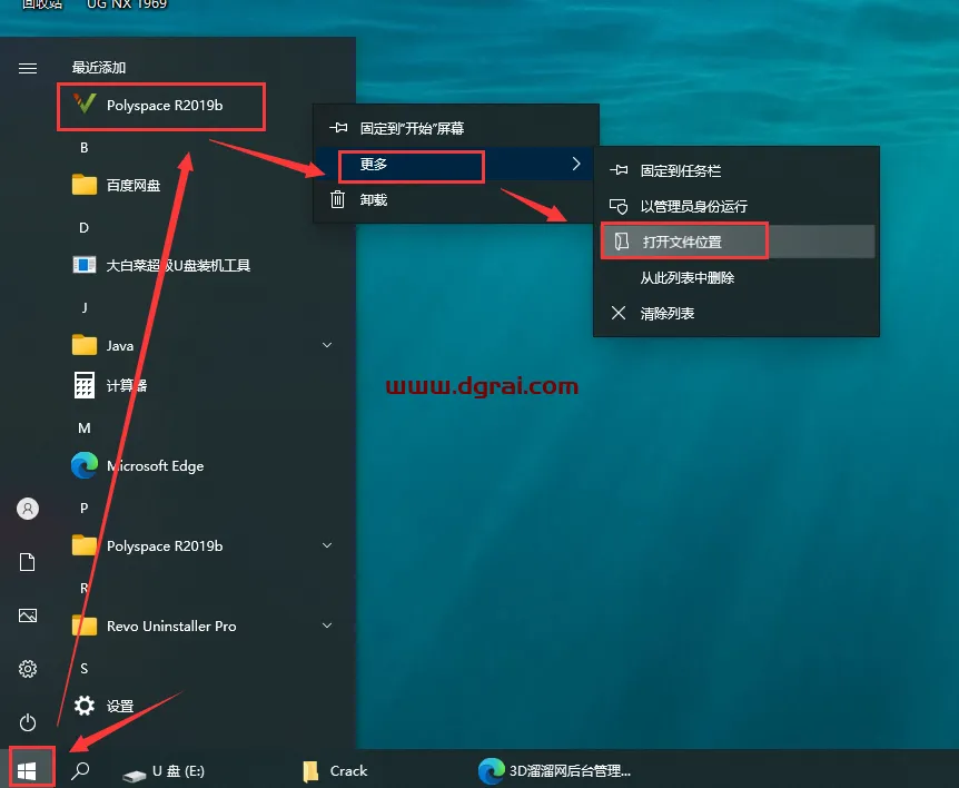 11、在电脑左下角开始菜单里面找到Polyspace R2019b鼠标右键点击更多-打开文件位置