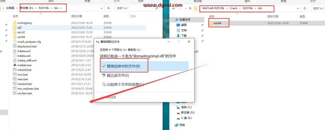 14、将安装包学习文件Crack\R2019b\bin里面的win64文件夹复制到安装目录R2019b\bin里面替换