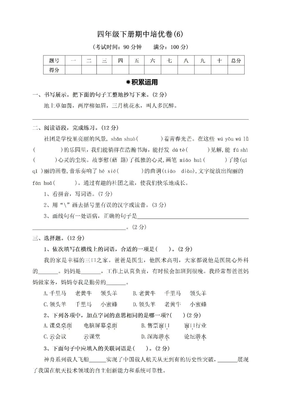 >四年级下册期中培优卷⑥附答案(免费下载)