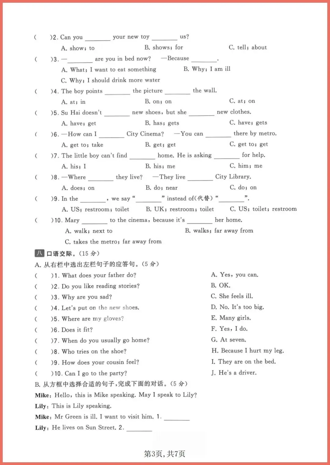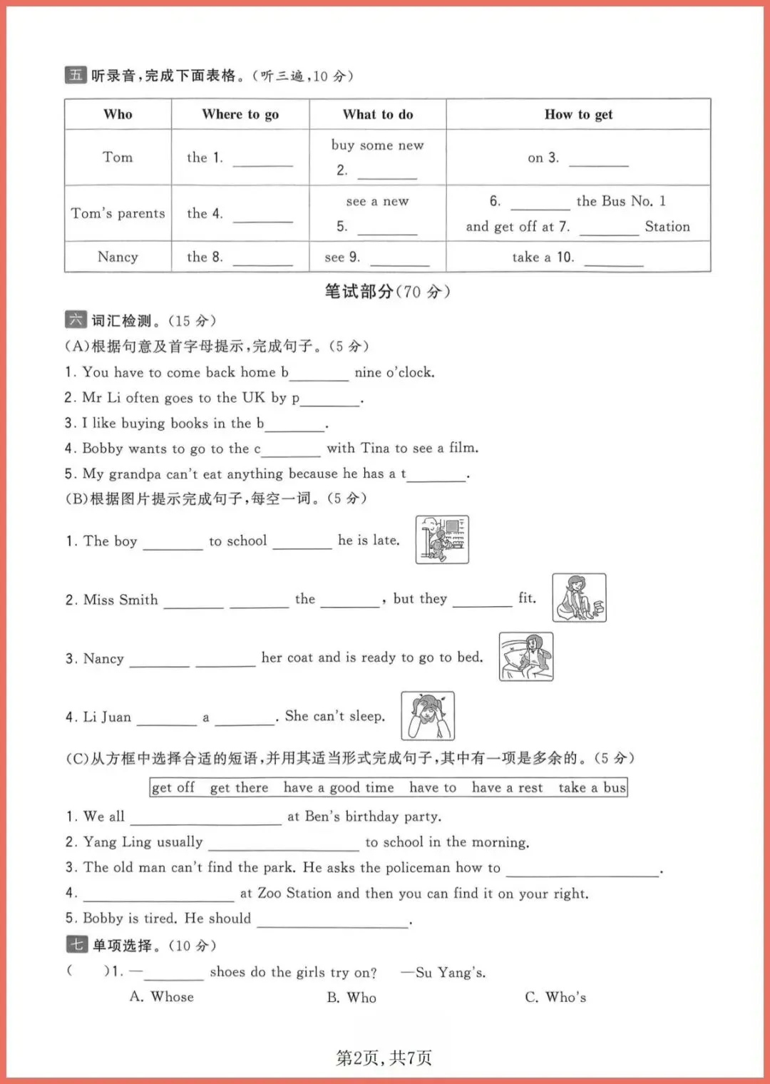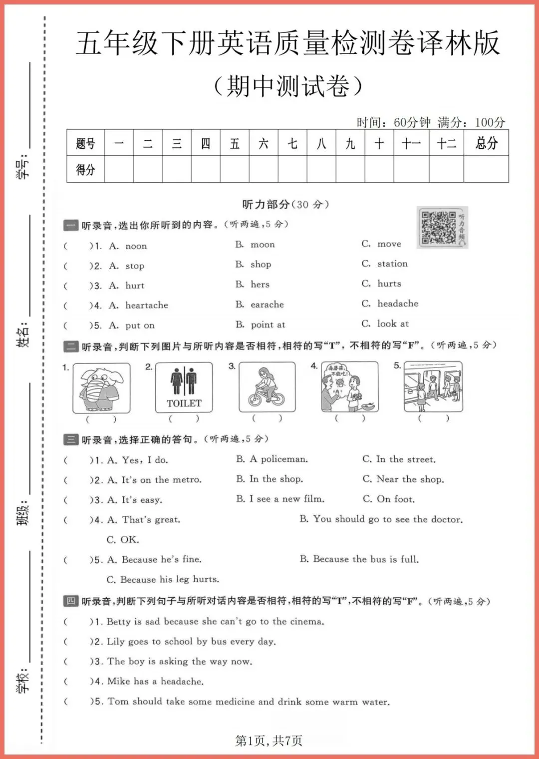 2026年春译林版五年级下册英语期中质量检测卷,共7页,电子版可打印。这套卷紧扣教材重难点,涵盖听力、词汇、句型、阅读、写作五大模块,题型与校内期中真题同步,附听力原文与参考答案。孩子限时练一遍,能快速定位薄弱点,听力磨耳朵、阅读练速度、写作学框架,考前刷完信心倍增!需要的家长别等,现在就打印,让孩子今晚练起来!