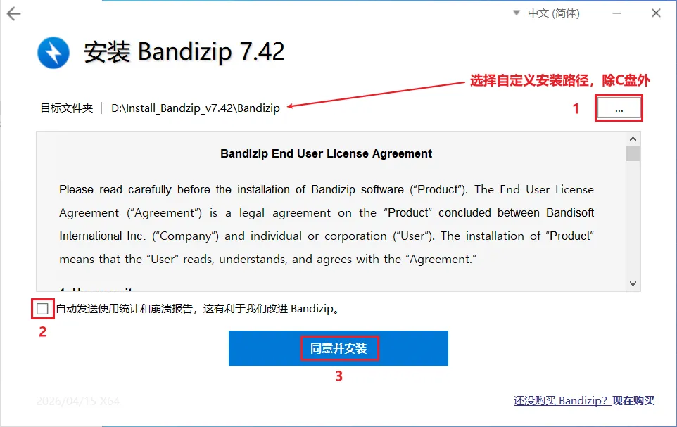 选择自定义安装路径(除C盘外),取消勾选自动发送统计和崩溃报告,点击:同意并安装
