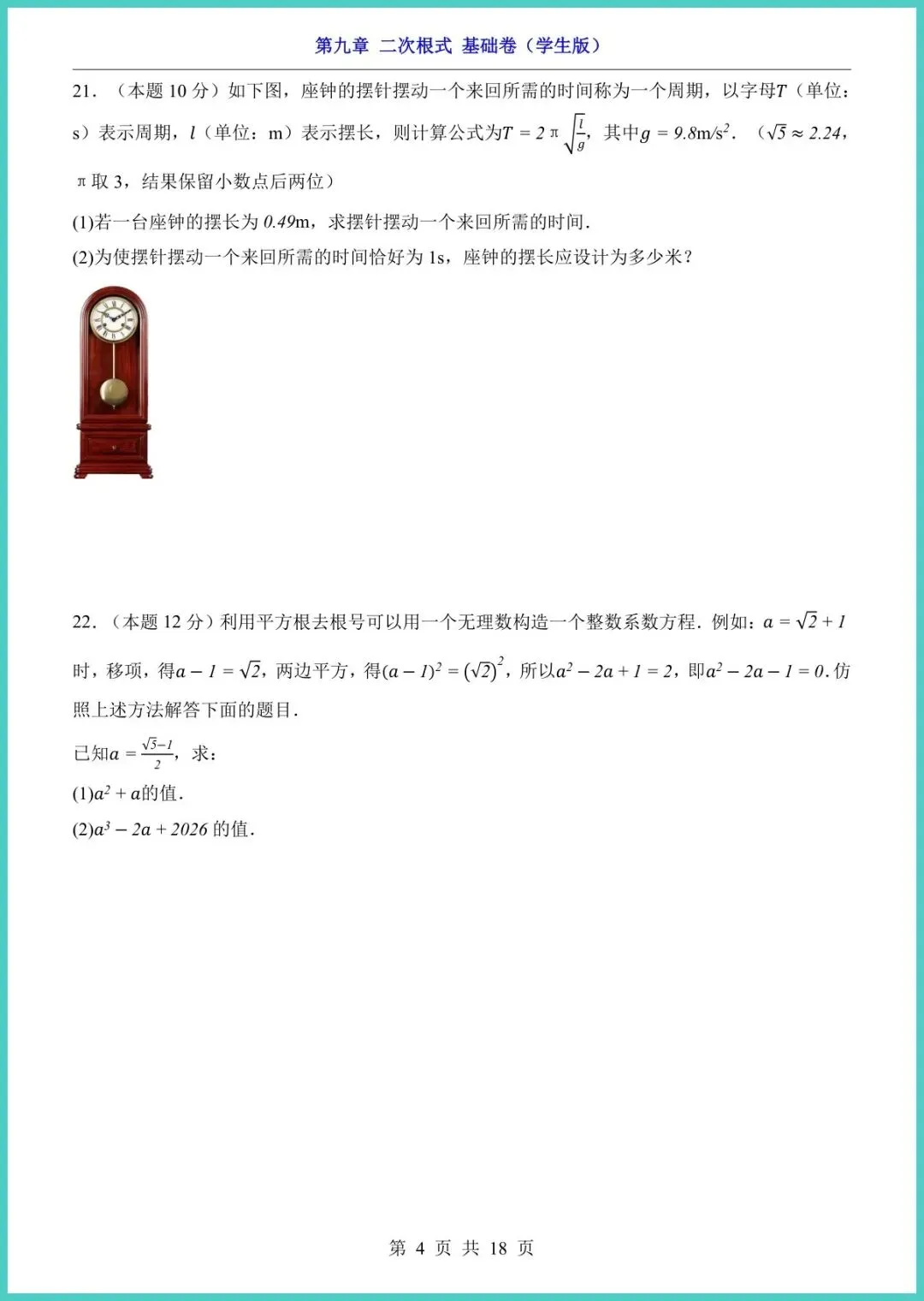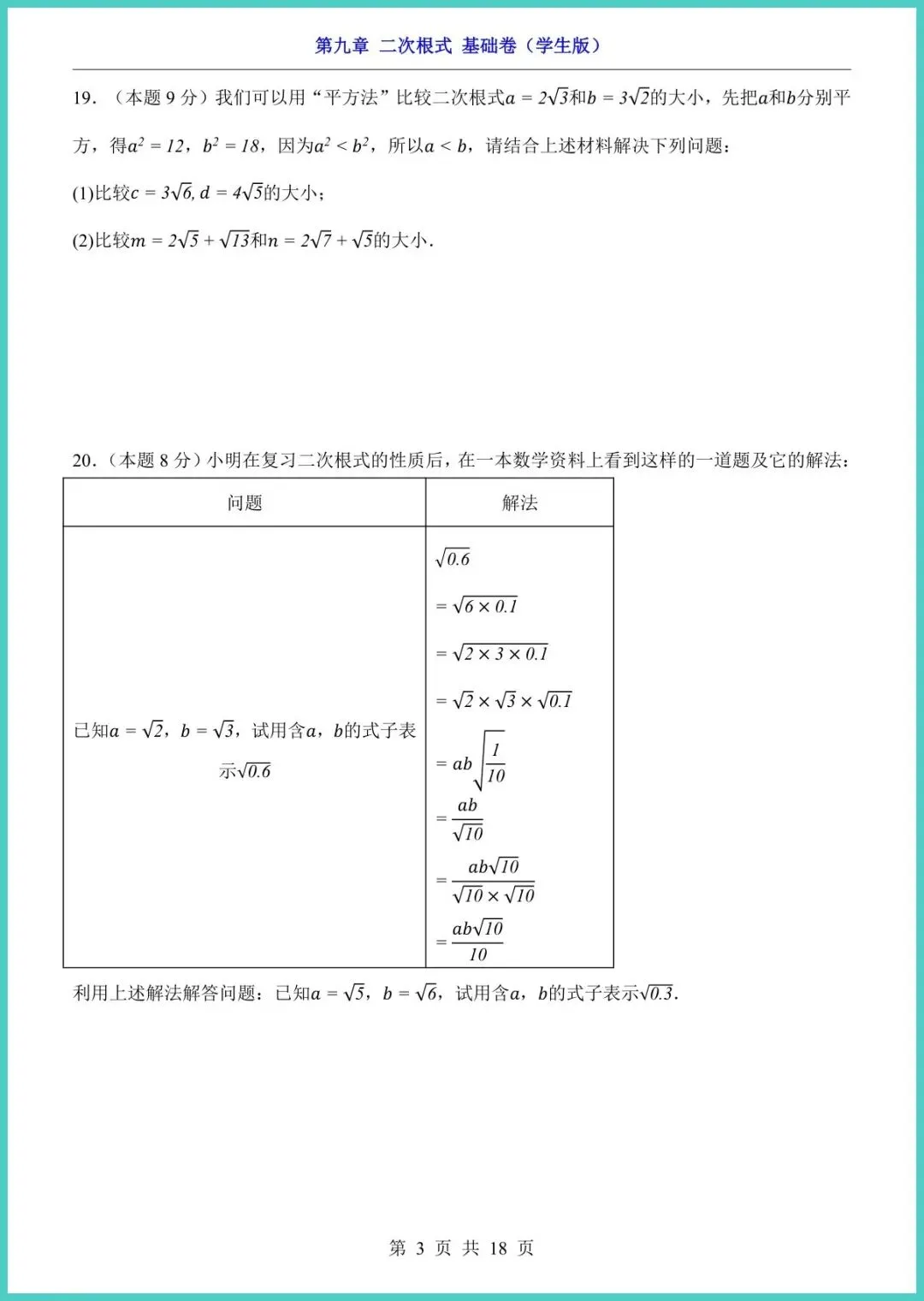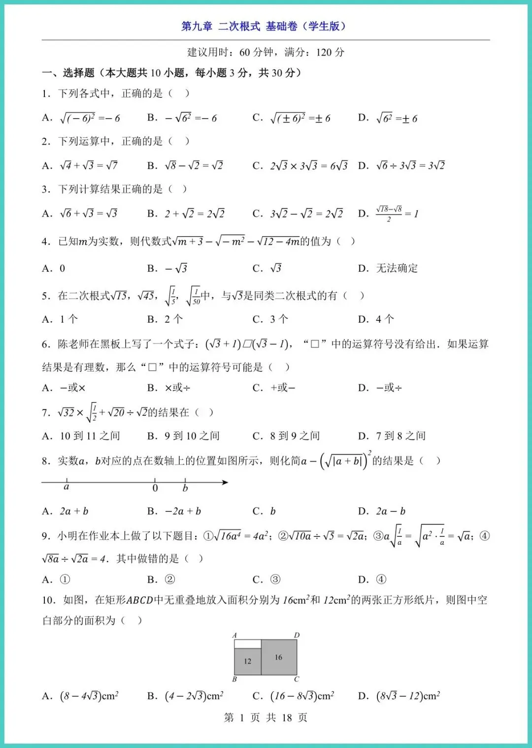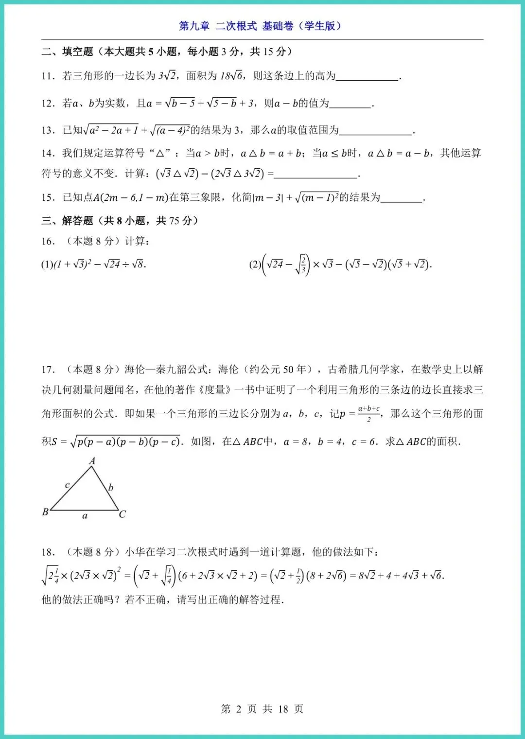 2026春青岛版八年级下册数学第9章《二次根式》基础卷新鲜出炉,18页满满干货,电子版一键可打印!这套练习紧扣课本,从二次根式的概念、性质到化简、运算、应用题,层层递进,配典型例题易错点睛梯度小测,帮孩子先把地基打牢,再稳步提分。每天10分钟,扎实练透一个点,考试不丢冤枉分!想让孩子告别“根号恐惧症”的家长,赶快打印出来,今晚就练起来!
