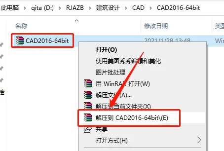 1.打开下载的软件安装包,鼠标右击压缩包【解压到CAD2016】。