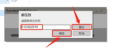 5.点击【更改】选择安装程序解压路径,不建议安装在C盘,可在D盘或E磁盘里面新建一个CAD文件夹(文件夹名称中不要有中文),设置好解压路径后点击【确定】。